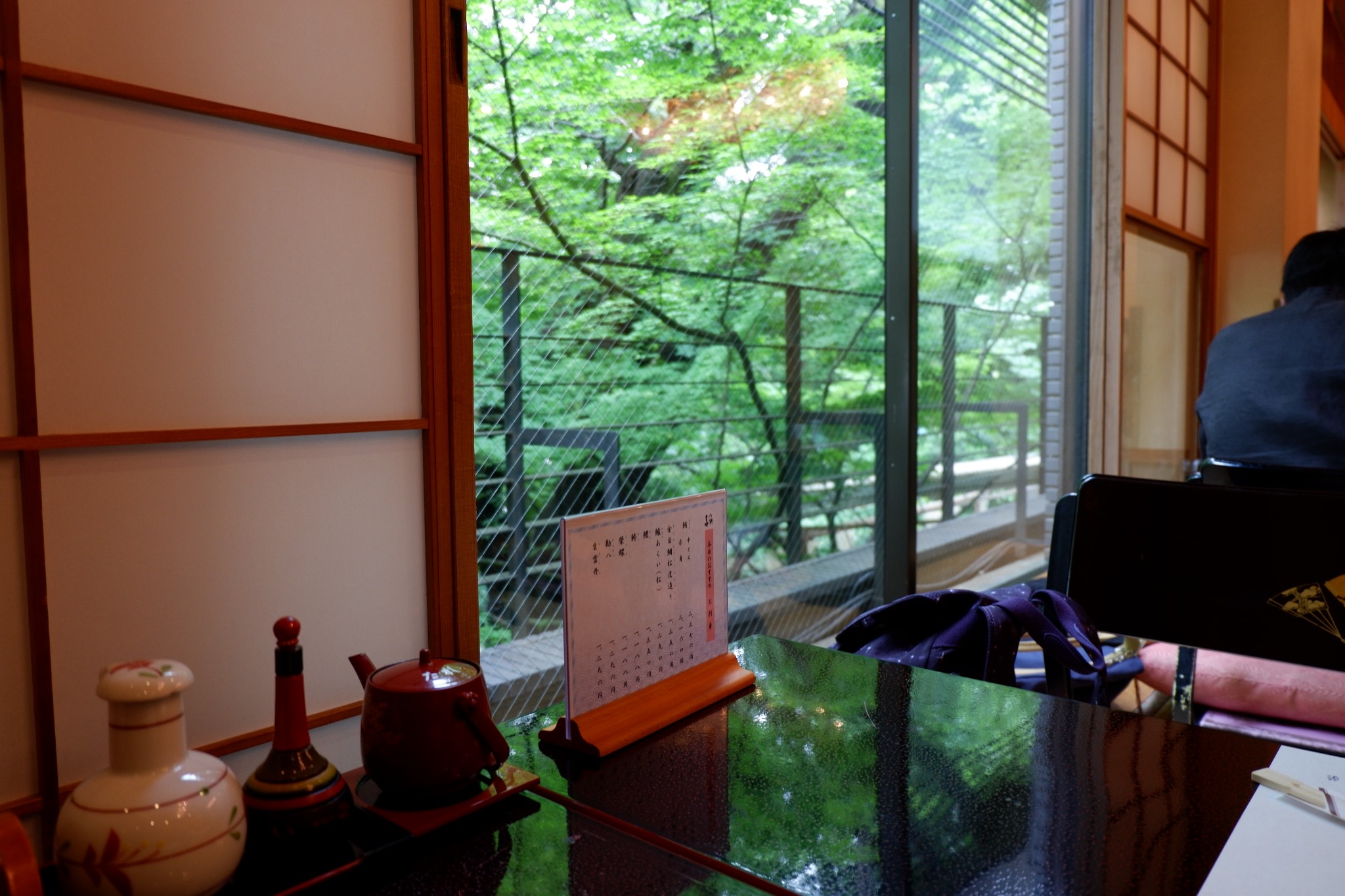 沿着上野公园里的主道走了一小段,就会看到路边立着指示牌,跟着指示牌继续往前走不远,就看到一幢二层日式小楼和周围清幽的环境融为一体,让人不禁心生欢喜。进去后,马上有身穿和服打扮优雅得体的中年大姐迎过来,帮我们换鞋,然后侍应生再领我们入座。我们最终坐在了二层靠窗边的位置,抬眼往窗外望去,一片绿意袭来,窗外的绿色还倒映在餐桌上,让人不由感叹能在此景的陪伴下吃饭是多么幸福的一件事呀