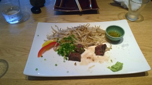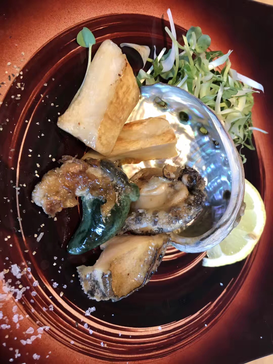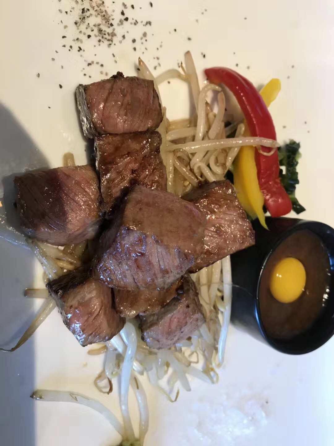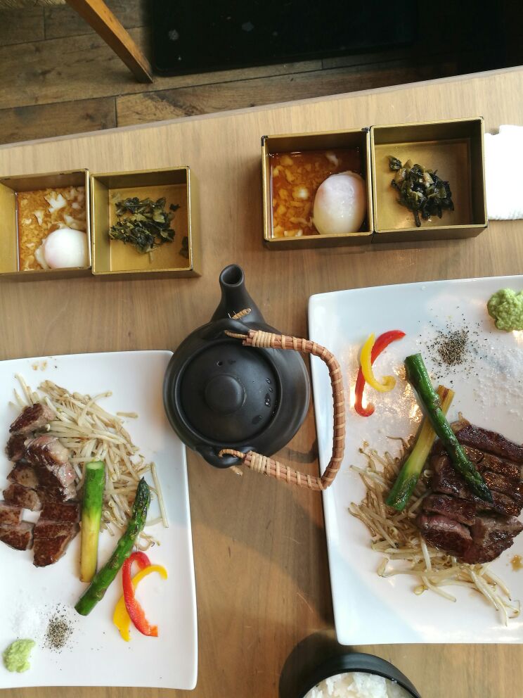 前菜是 一份 蟹肉沙拉, 虽然淋上了调味料,但是蟹肉的鲜味还是在的。 随餐一起上的还有一颗生鸡蛋,吃法好像是要把生鸡蛋倒入沙拉中,提升鲜味,楼主尝试了一下,味道还不错,没有鸡蛋的腥味。就是有点儿稠。。。正餐就是铁板牛肉了。虽然不是什么神户牛,但是味道还真是赞赞的!!