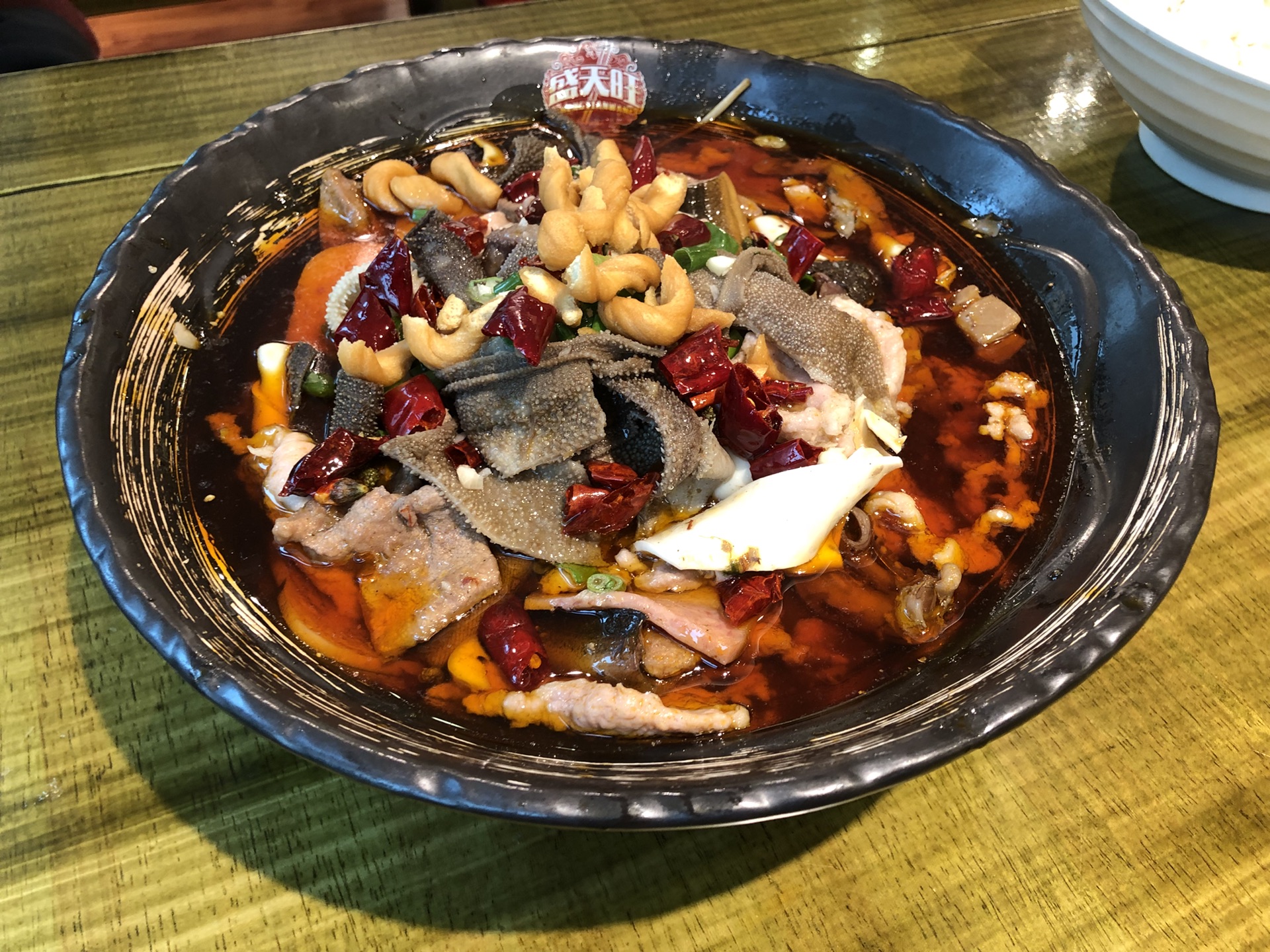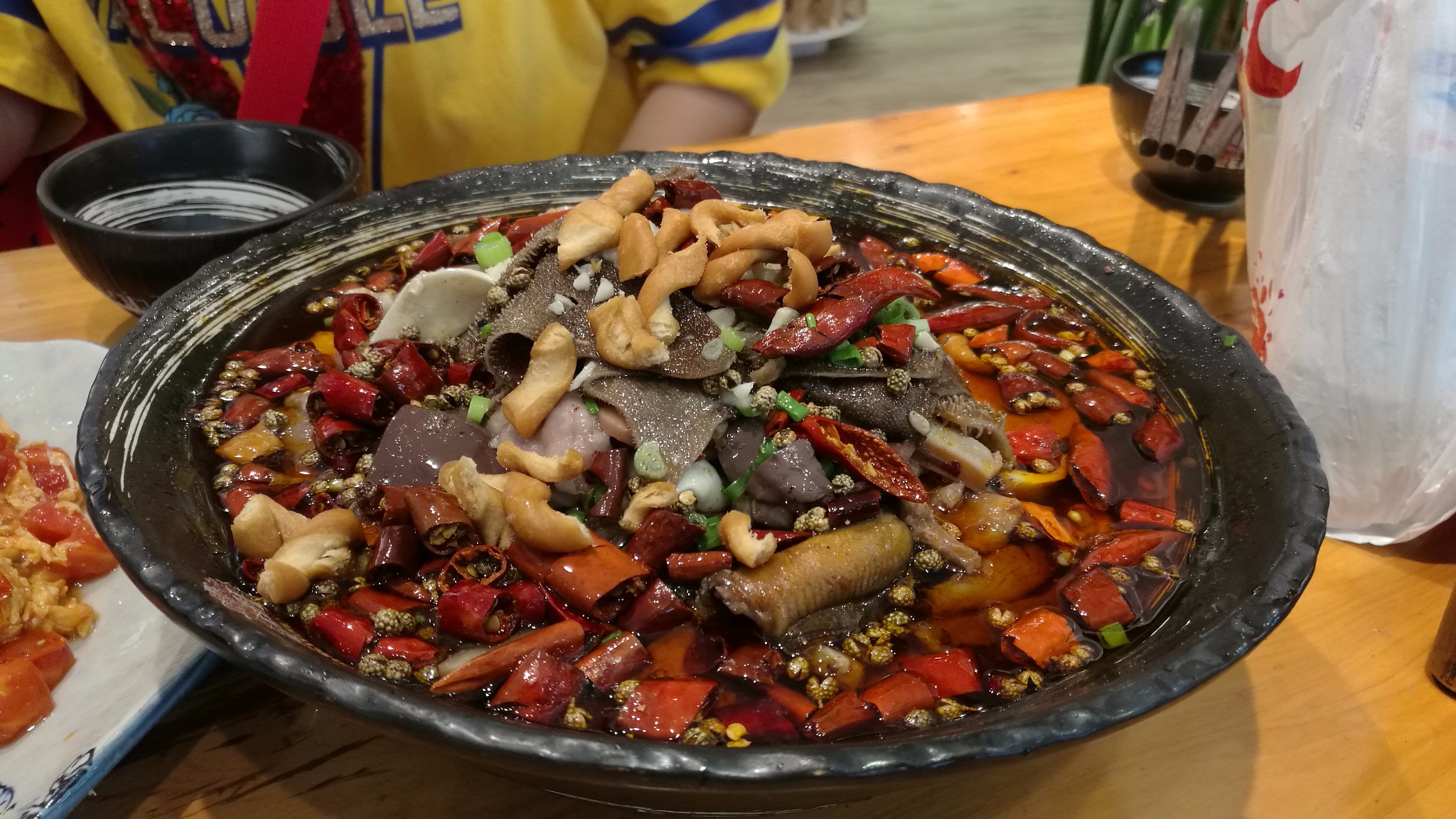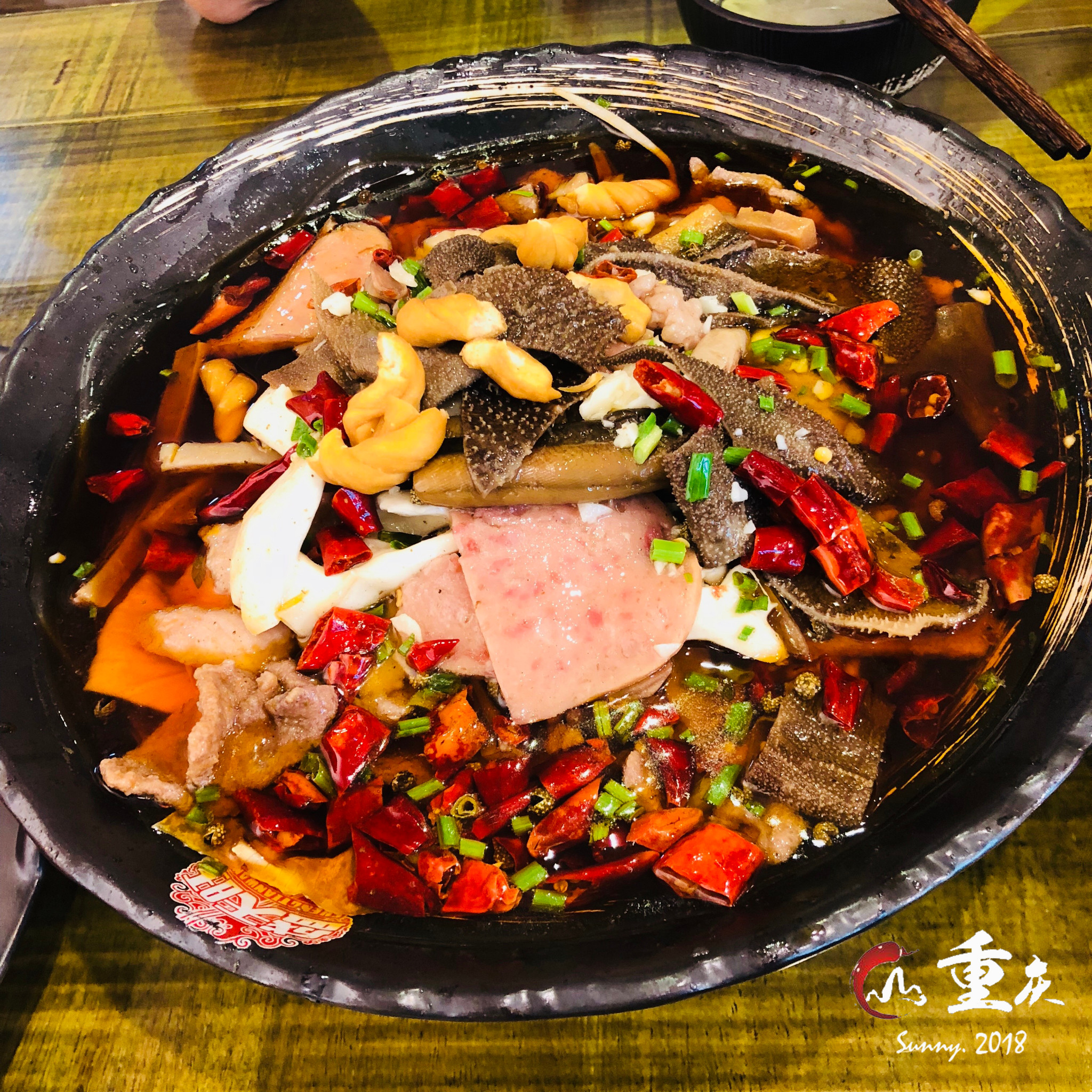看到网上有个128的套餐:毛血旺小份+辣子鸡+酥肉汤,果断选择这个,想吃的都有。毛血旺端上来的时候我脑子里第一反应是不是上错了?这个比脸还大的盆是小份?重庆人民也太实在了吧。量是很大,但口味的话个人感觉一般,里面的菜都不入味。辣子鸡反而超级好吃!又麻又辣,一颗颗的面粉少鸡肉多,完全停不下来~还有一个酥肉汤,就是把香酥鸡泡在白菜汤里,吃的辣了喝几口汤漱漱口,推荐指数:3星,无需排队,没必要特地去吃,最好人多点,2个人完全吃不完。