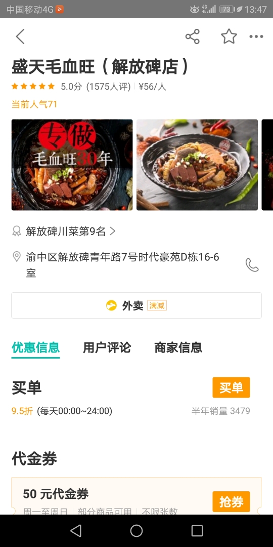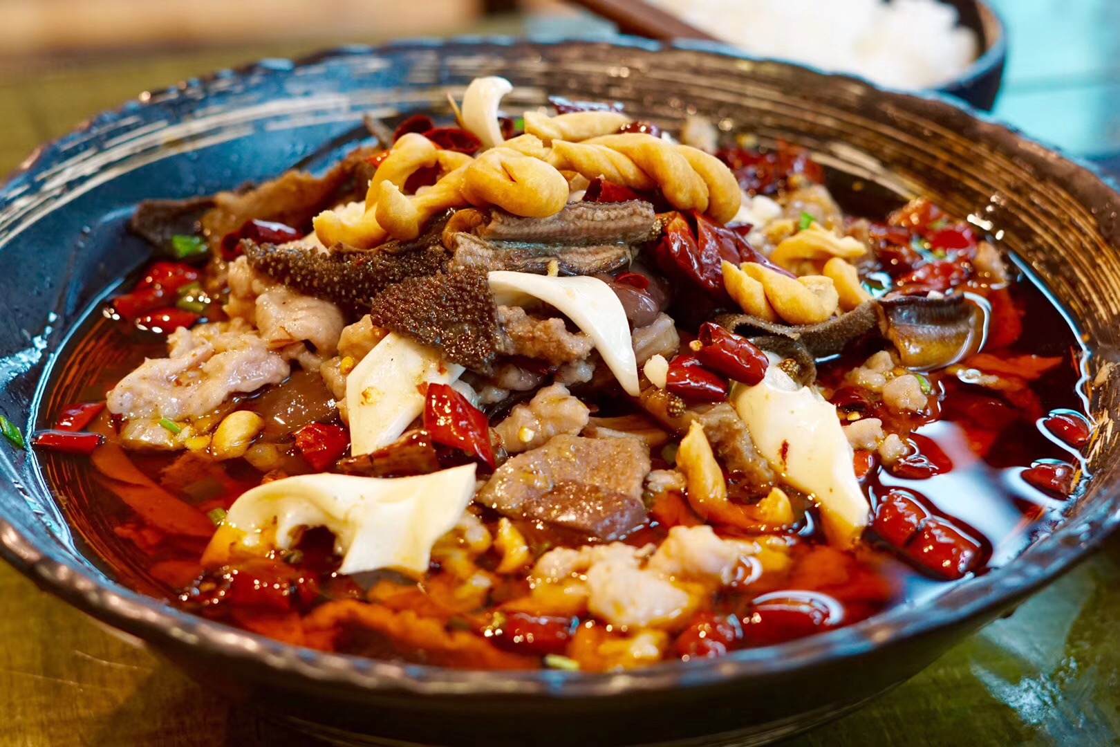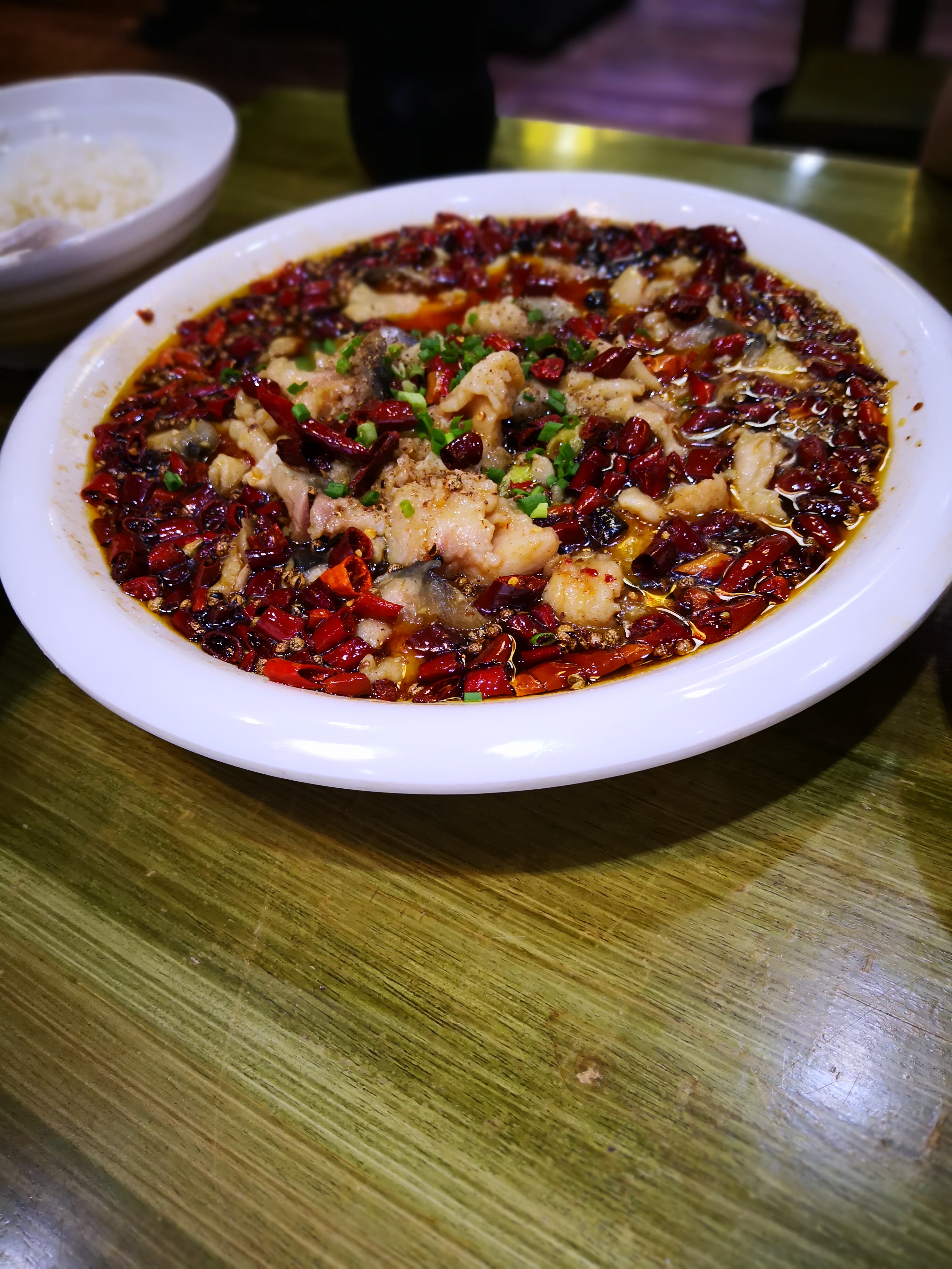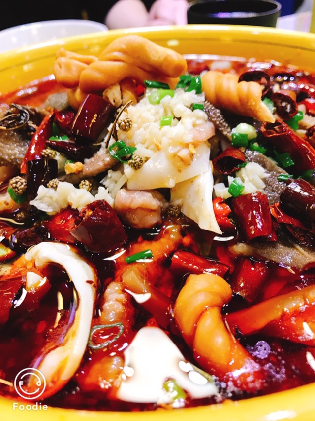 看到网上有个128的套餐:毛血旺小份+辣子鸡+酥肉汤,果断选择这个,想吃的都有。毛血旺端上来的时候我脑子里第一反应是不是上错了?这个比脸还大的盆是小份?重庆人民也太实在了吧。量是很大,但口味的话个人感觉一般,里面的菜都不入味。辣子鸡反而超级好吃!又麻又辣,一颗颗的面粉少鸡肉多,完全停不下来~还有一个酥肉汤,就是把香酥鸡泡在白菜汤里,吃的辣了喝几口汤漱漱口,推荐指数:3星,无需排队,没必要特地去吃,最好人多点,2个人完全吃不完。