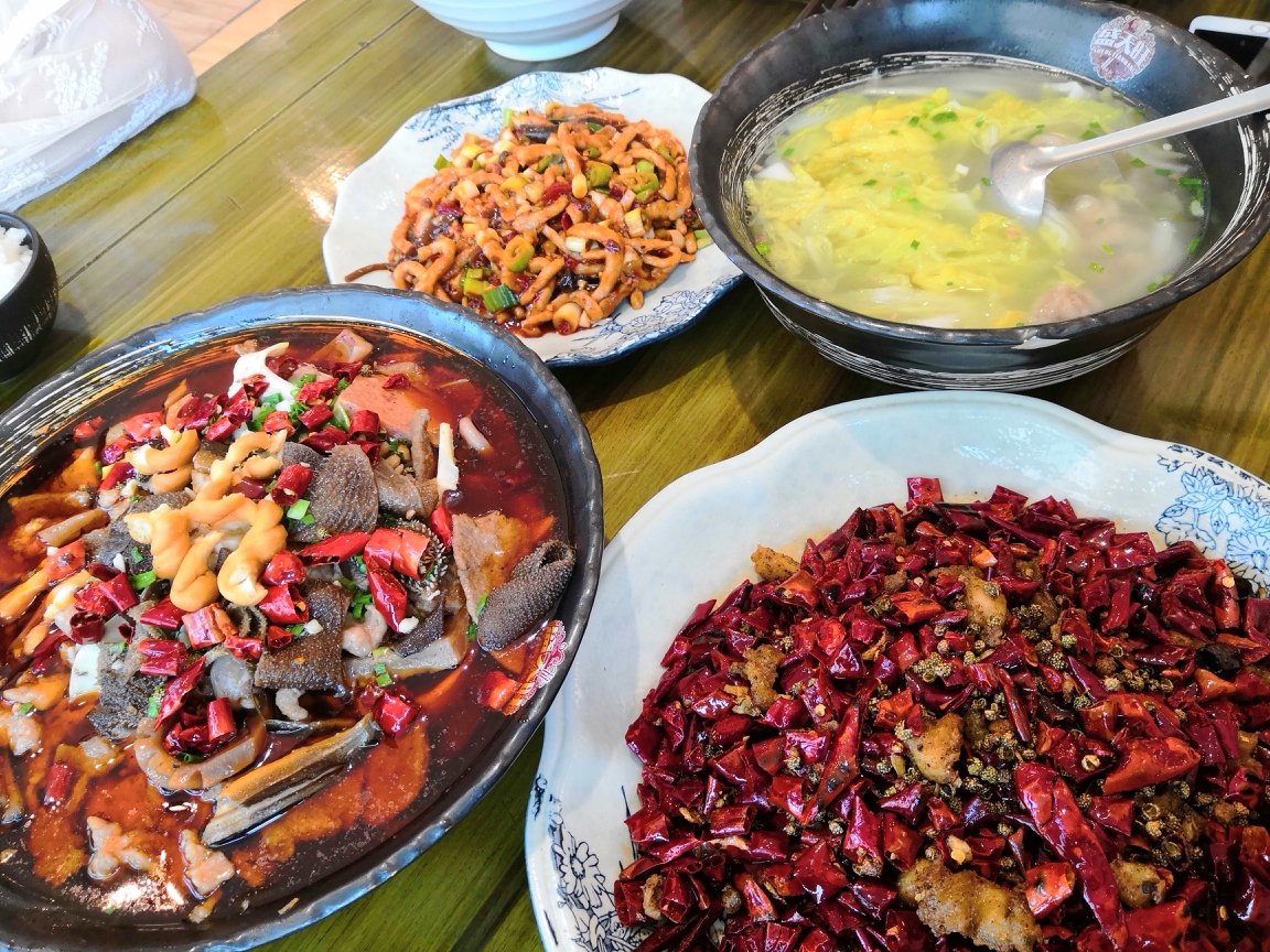 看到网上有个128的套餐:毛血旺小份+辣子鸡+酥肉汤,果断选择这个,想吃的都有。毛血旺端上来的时候我脑子里第一反应是不是上错了?这个比脸还大的盆是小份?重庆人民也太实在了吧。量是很大,但口味的话个人感觉一般,里面的菜都不入味。辣子鸡反而超级好吃!又麻又辣,一颗颗的面粉少鸡肉多,完全停不下来~