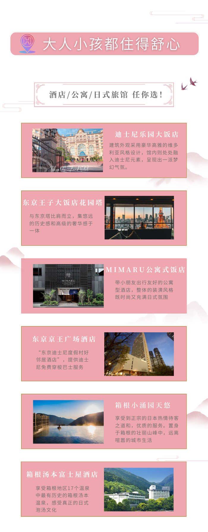 2.酒店:全程星级酒店;东京4晚酒店,箱根1晚日式酒店(可另定制酒店,详询客服)