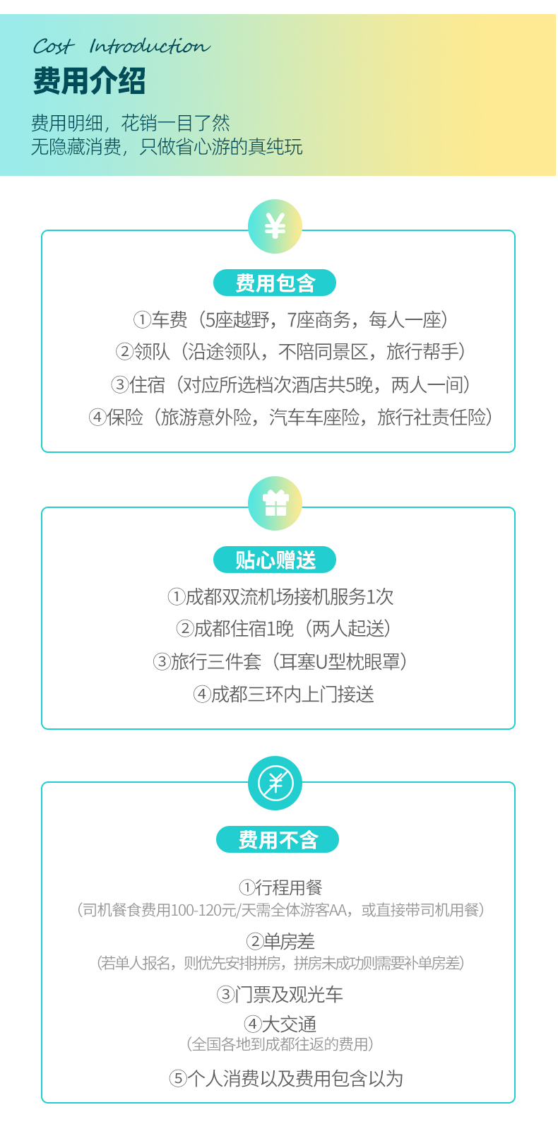 ②司机补贴:司机餐食(淡季100/天,旺季120-150/天)由全体乘客AA。选择单拼车无住宿的游客需额外AA司机的住宿费用(淡季100/天,旺季150/天)