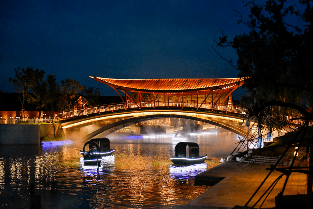 登上通翠河的观光船,沿途将穿过鱼跃广场、龙门桥、筏木里、捕鱼水寨、小鲜州、梯田彩虹、西坊等项目;夜晚降临,可乘船观赏拾光演出、渔火演出、鸟类演出、幻境之桥等演出,领略游乐岛整体旖旎风光和东坊市集的人间烟火之气。