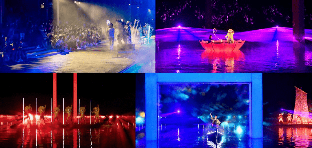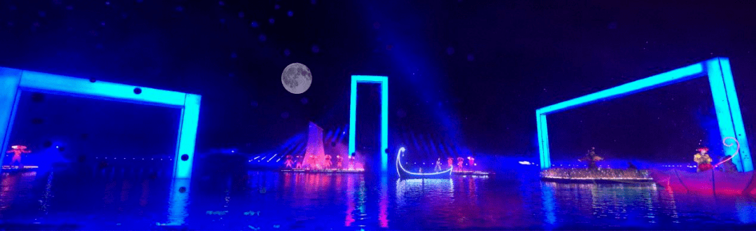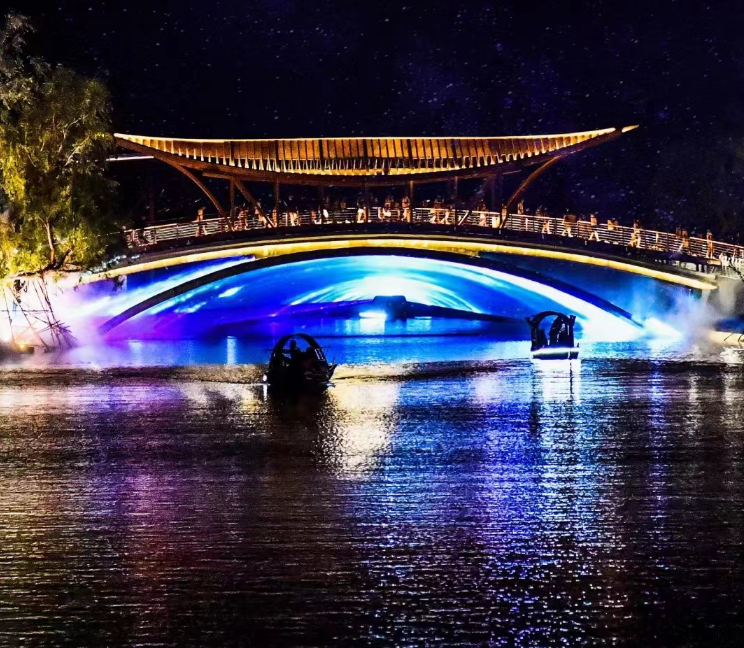 从登岛开始,可以观赏《幻境之桥》、《星河》、《拾光》、《渔火》、《原野》、《山海秘境》、《偶遇》、《风雨》等十余个演艺节目,依托渔田·七里海度假区的游乐岛景观,大量运用裸眼3D、全息投影成像、雾气成像、水特效、烟火秀、AR互动等高科技光影技术,构建出“多个戏剧空间站”的超现实主义场景,为游客呈献出声、光、电、水、火、影、音为一体的立体视觉感官盛宴。