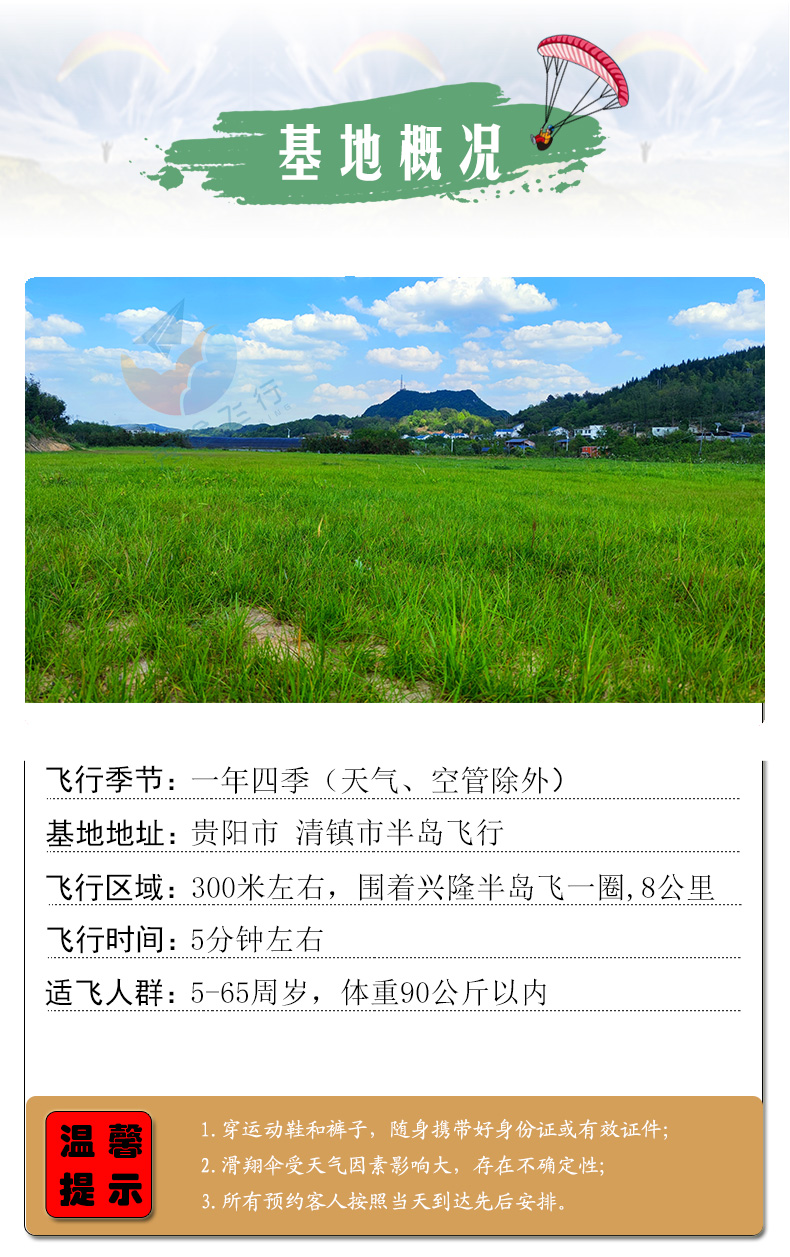 滑翔伞飞行体验和天气息息相关,气象条件动态变化中,天气预报不能完全判定天气情况,如果预约后因为天气变化不能飞行或空中临时管制,可以改期或退款,出行无忧!
