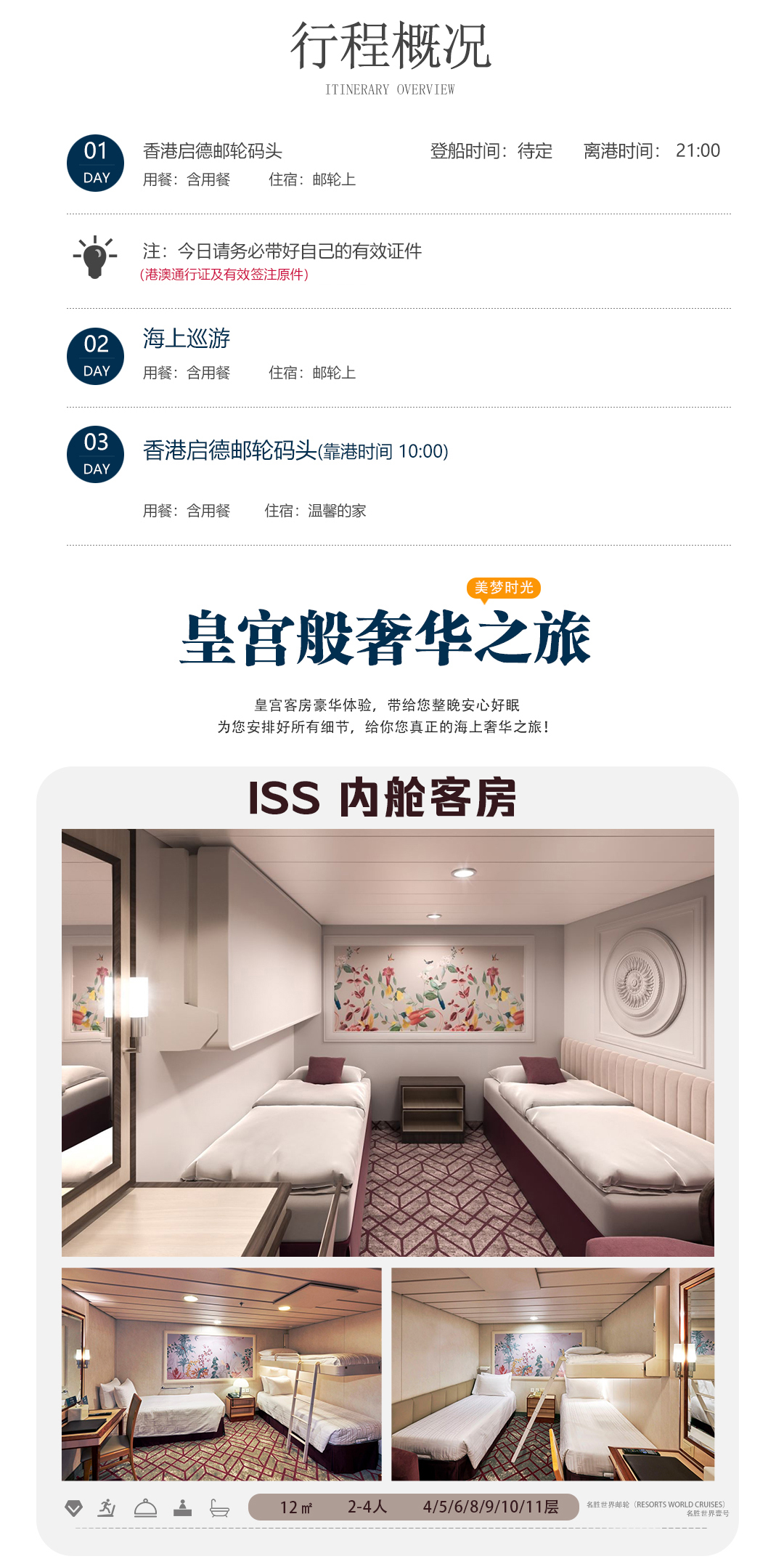 - 服务费:内舱-露台客房港币 300/人,皇宫套房及以上港币 400/人(船上支付);