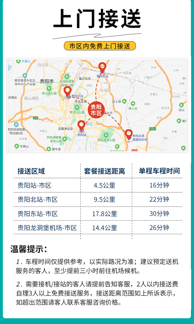 2、由于贵阳市比较大,所以我们在金阳区,花果园区接送,单拼车客人请把住宿订在这两个区域!方便接送不耽误大家时间。