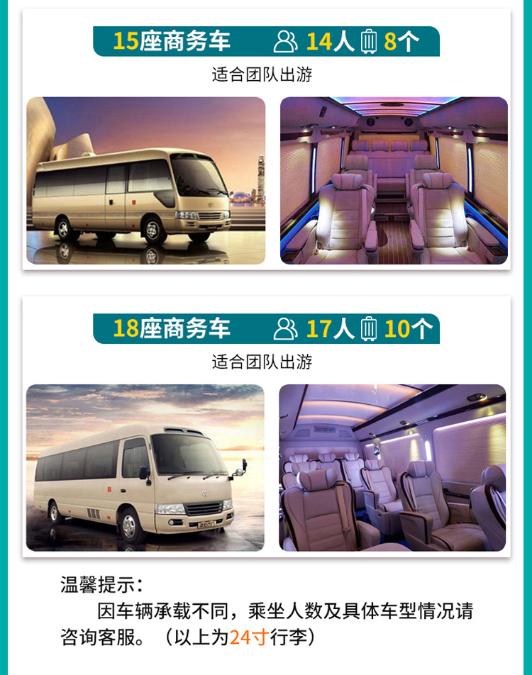 3、司机会在出发前1日17:00-21:00沟通行程事宜,敬请留意,保持电话畅通,以免耽误行程!如未和您联系请务必和我们客服联系;