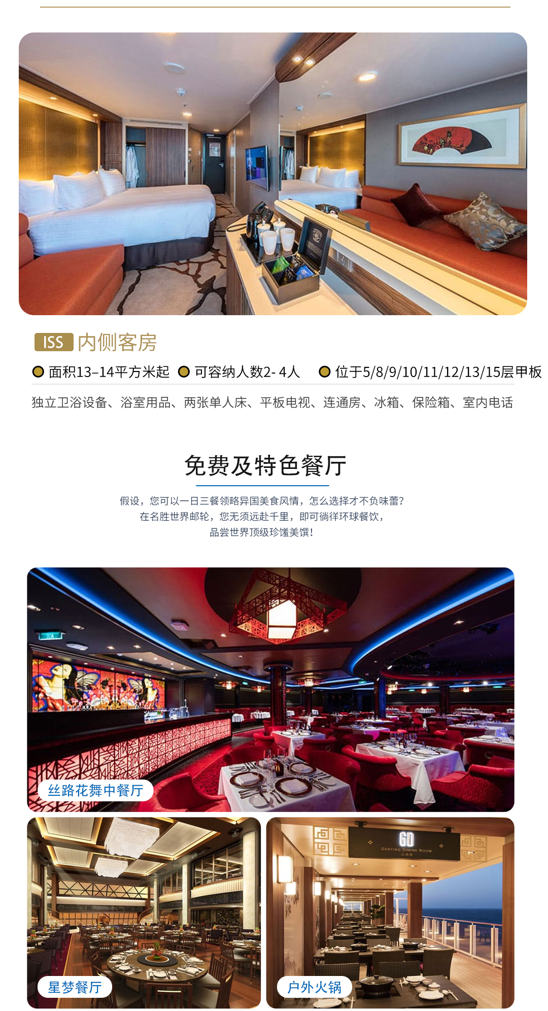 4、第1、2人报价是以两人共住一间舱房为标准。第3、4人是指与其它两位乘客同住一间游轮舱房,陆地酒店不占床含早餐。阳台舱以下等级的第3、4人为上铺,阳及以上等级第3、4人为客厅里的沙发床。游轮上第三/四位乘客的名额有限,以当时报名向游轮公司申请批准为准,建议早些申请。