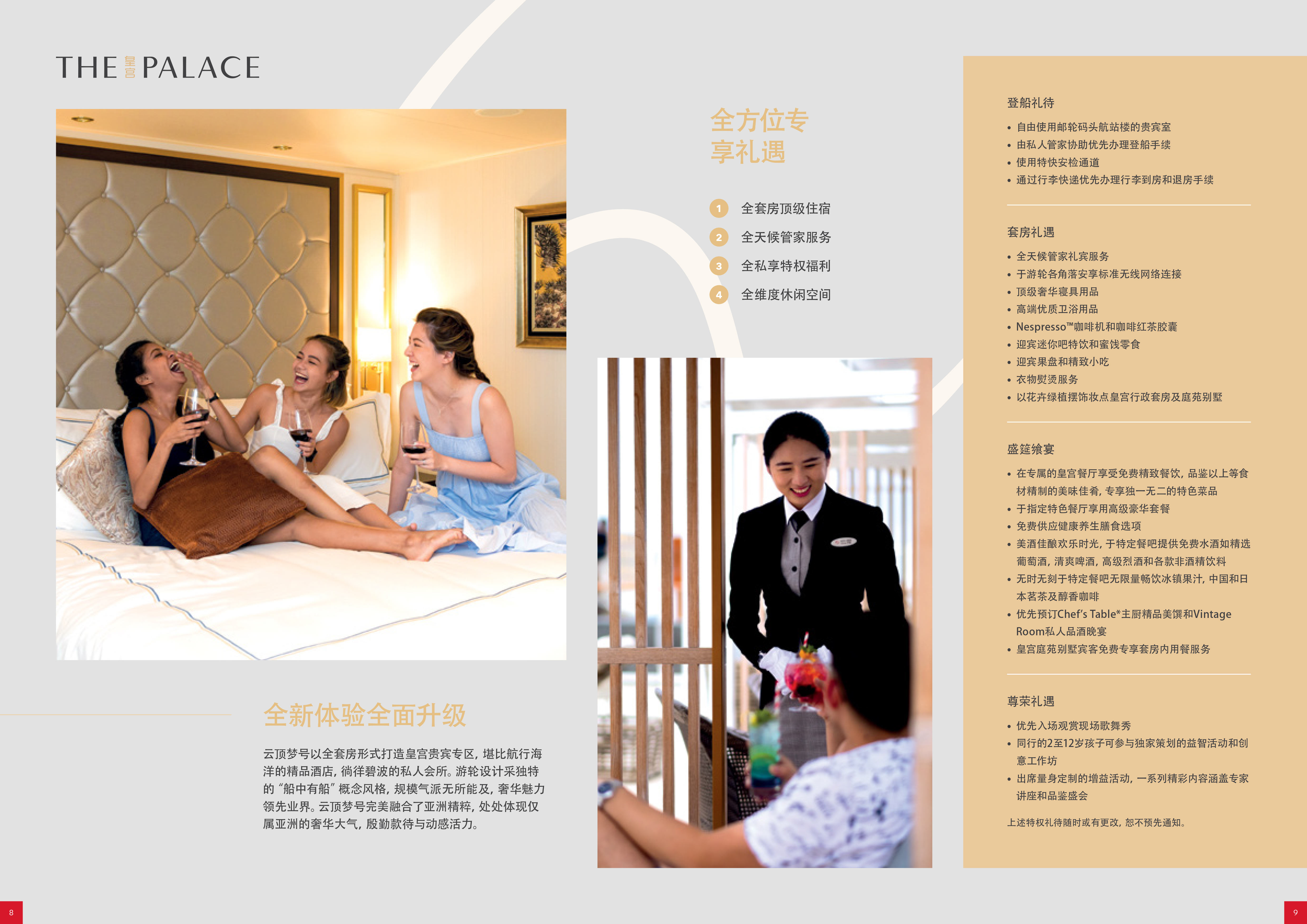 4、第1、2人报价是以两人共住一间舱房为标准。第3、4人是指与其它两位乘客同住一间游轮舱房,陆地酒店不占床含早餐。阳台舱以下等级的第3、4人为上铺,阳及以上等级第3、4人为客厅里的沙发床。游轮上第三/四位乘客的名额有限,以当时报名向游轮公司申请批准为准,建议早些申请。