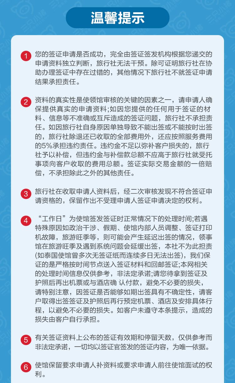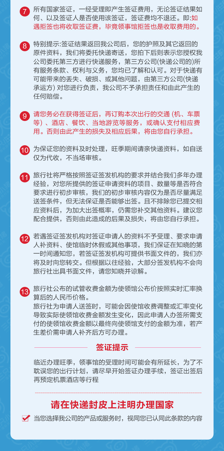 2. 若相关办理部门(包括并不限于使馆、政府部门、签证中心、保险公司等)有政策性费用调整,差额需由客人自行承担,敬请谅解。