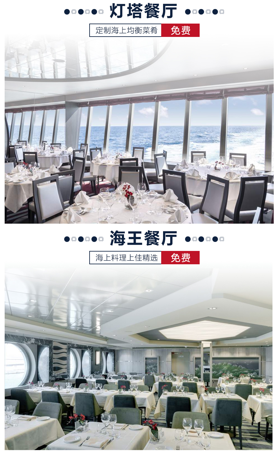 - 船上的用餐及娱乐项目绝大部分免费。收费的项目有:收费餐厅、咖啡厅、酒吧、娱乐厅、剧院等单独出售的所有饮料;特殊咖啡(如卡布基诺、特浓咖啡等)、含酒精类饮料、酒类、可乐、汽水等;私人开销:如卫星电话费、美容美发、按摩、商店购 物等;上网费用;娱乐场的筹码;船舱内的瓶装矿泉水;就诊挂号费用、治疗费及药费。(具体以船上收费为准)