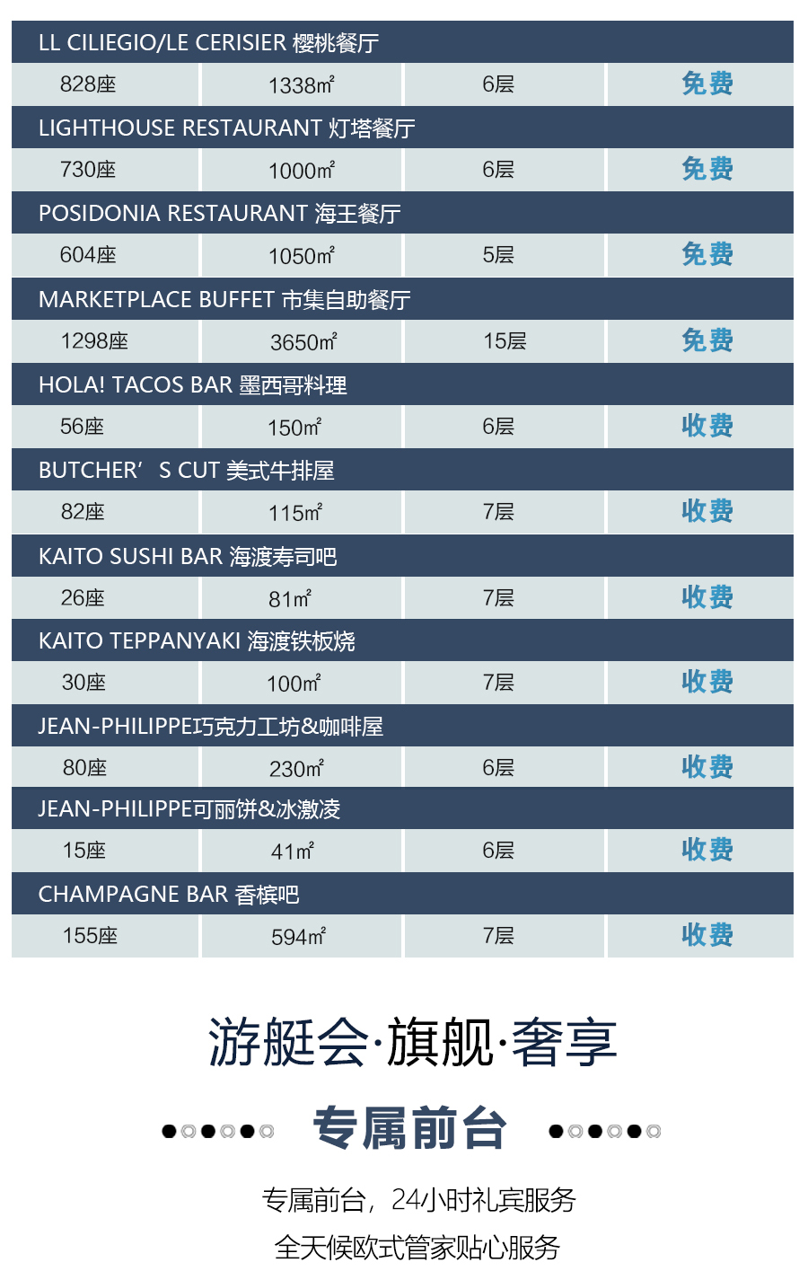 - 服务费: 2周岁以上包含2周岁:内舱、海景、阳台、套房14.5美金每人每晚,游艇会套房19.5美金每人每晚,2周岁以下的乘客免收邮轮服务费(船上支付);