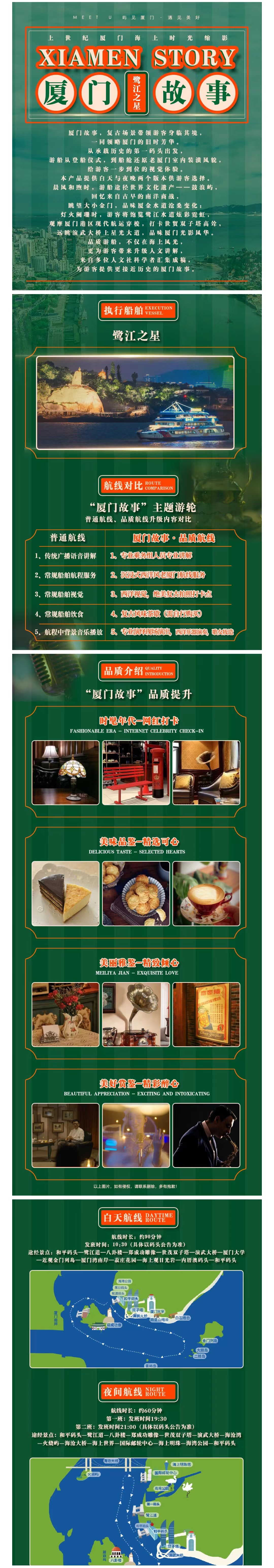 航线:和平码头→鹭江道→八卦楼→郑成功雕像→地标·世茂双子塔→演武大桥→海沧湾→火烧屿→海沧大桥→海上世界→国际邮轮中心→海上明珠→海湾公园→返航