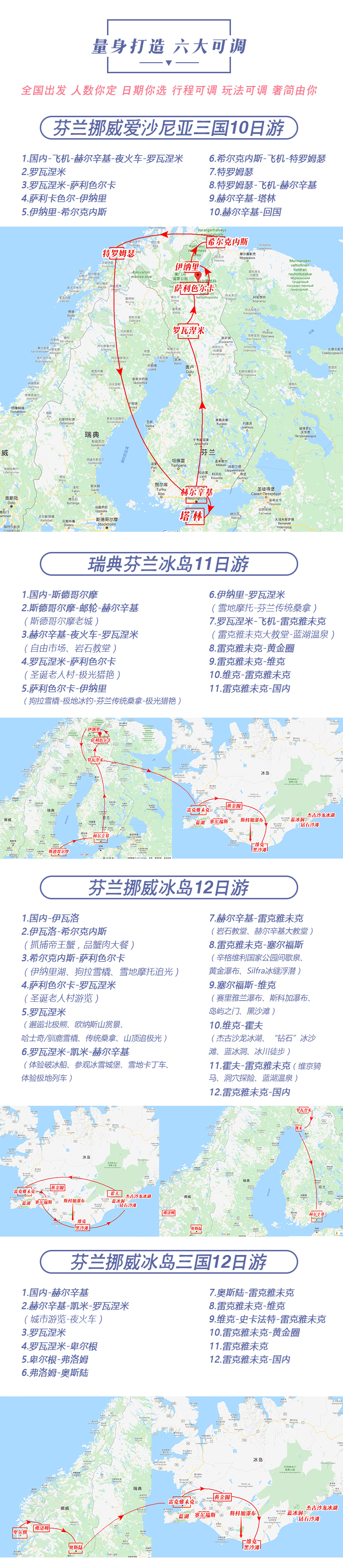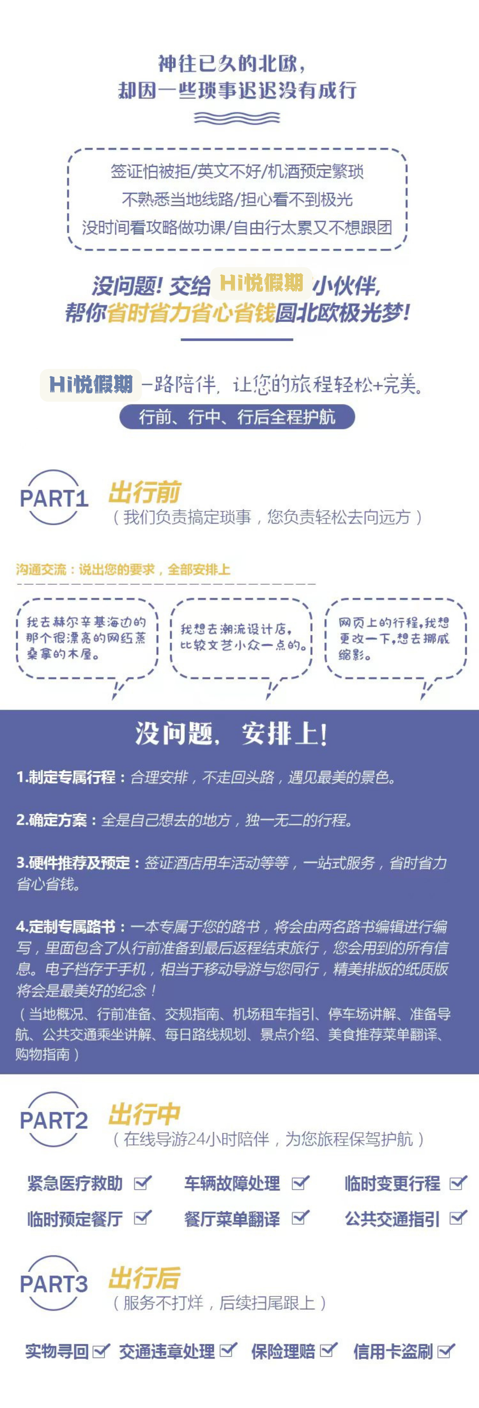 罗瓦涅米【1晚】 哈帕兰达【1晚】 阿比斯库【2晚】 特罗姆瑟【2晚】 奥斯陆【1晚】 赫尔辛基【1晚】 3. 交通:默认大众交通,下面所列交通已包含