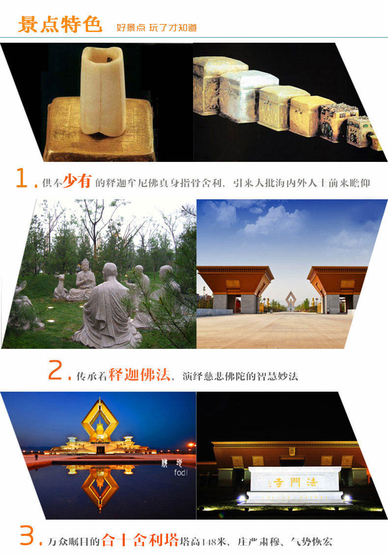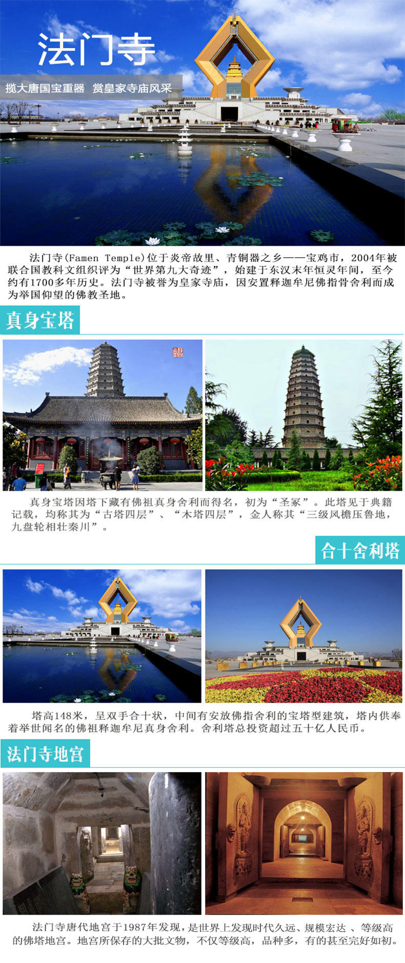 法门寺·始建于东汉,是唐代的皇家寺庙,因安置释迦牟尼佛指骨舍利,成为举国仰望的佛教圣地。 ·相传为使佛教发扬光大,佛祖舍利被分送给各地,凡得舍利处都要建造佛塔供奉,法门寺就是其中之一。 ·如今的法门寺分为两部分:唐代风格的旧址建筑群(法门寺院和珍宝馆)与令人...