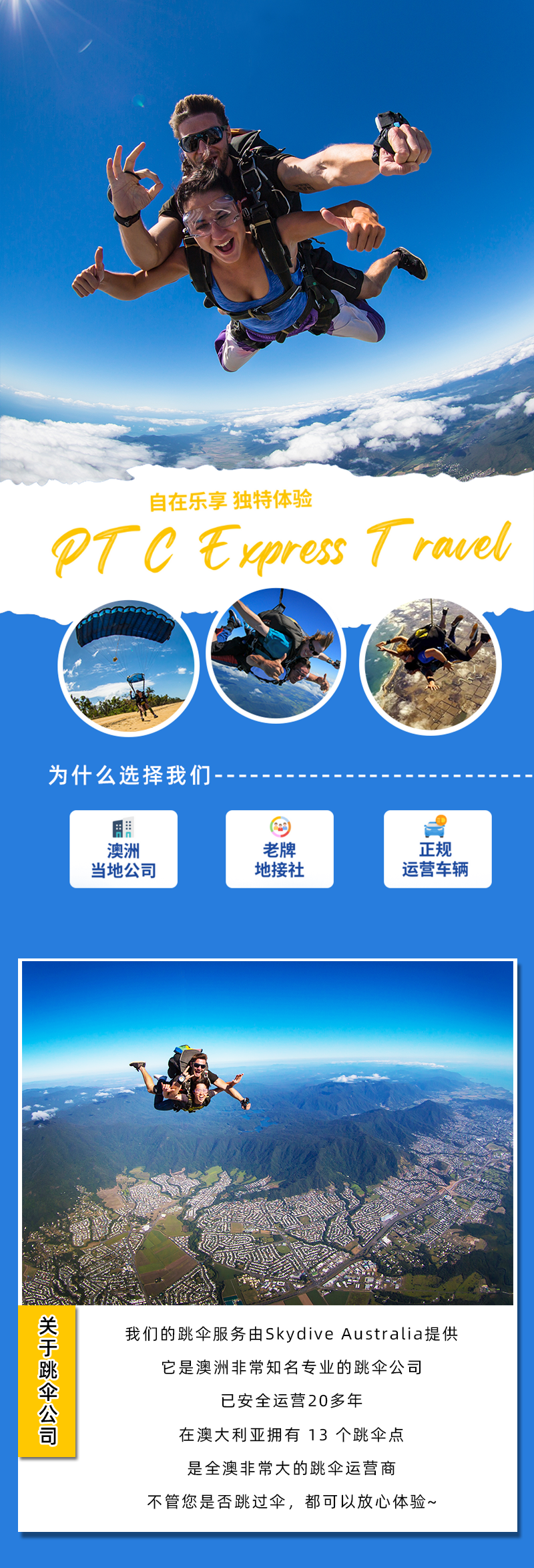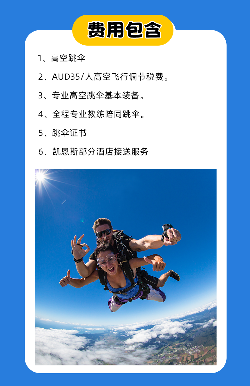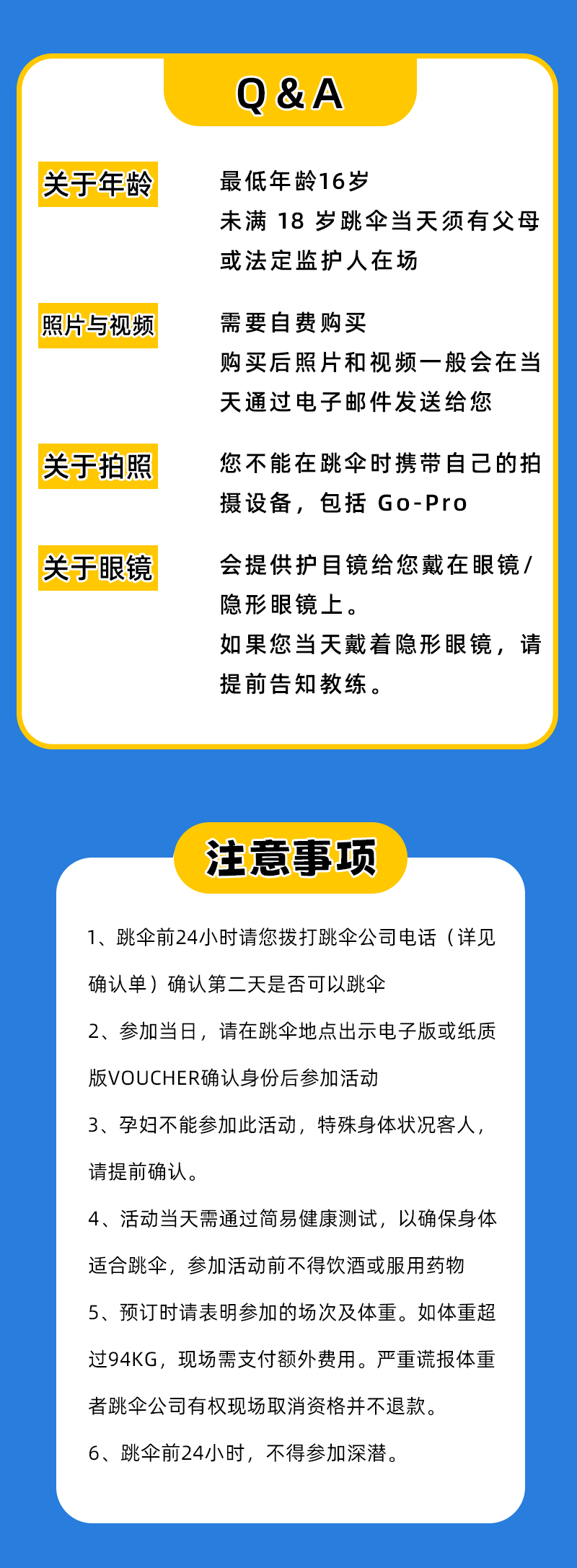 5.高空跳伞受天气情况影响较大,请尽量选择抵达后第一天参加活动,如遇上天气问题,则可相应顺延至第二或第三天;在跳伞前一天请直接拨打跳伞公司电话二次确认是否隔天是否可以跳伞。