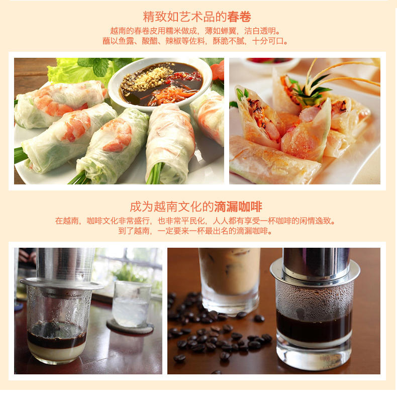 6. 饮食:越南的主食是饭(米饭),但最著名的却是“粉”(音fě),类似过桥米线,鸡汤或是牛肉汤。海鲜——来越南最不能放过的就是海鲜了。越南海岸线3500多公里,渔业发达,几乎任何一个沿海城市,都是重要的渔港。