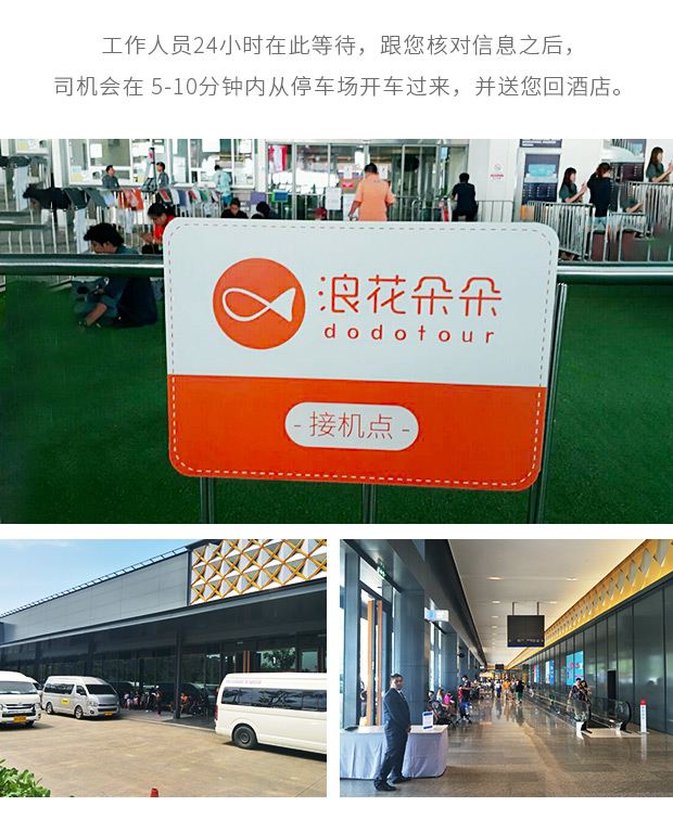 2.选择其他套餐的客人,在出机场3号或4号厅后,直接找到举着自己英文名字+中文名字牌子的司机,在“浪花朵朵”牌子附近,跟着司机上车回酒店即可。