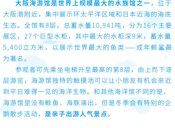 大阪海游馆Osaka Aquarium Kaiyukan·大阪海游馆是世界上规模最大的水族馆之一,因拥有巨大的鲸鲨而著名,是亲子游人气景点。 ·可乘坐电梯升至最高的第8层,由上而下逐层游览,触摸池可以让小朋友有机会亲近到海洋生物。 ·馆内中央的大水缸中展示着鲸鲨,是海游馆最有名气的动物明星,还特设了同样大小的...