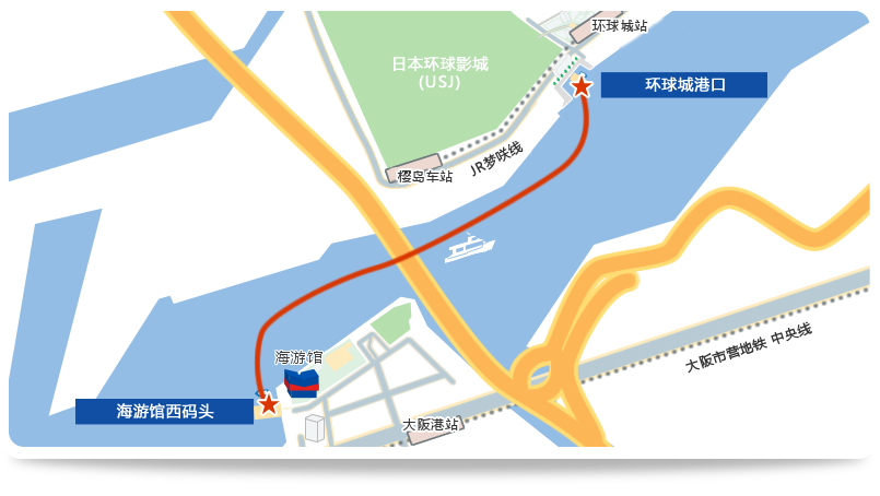 从大阪站(Osaka)乘坐大阪市营巴士(88路)约需45分钟;从难波站(Namba)乘坐大阪市营巴士(60路)约需40分钟在“天保山港湾村站(Tempozan)”下车即到KAIYUKAN。