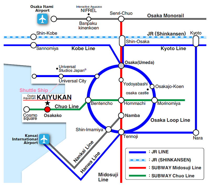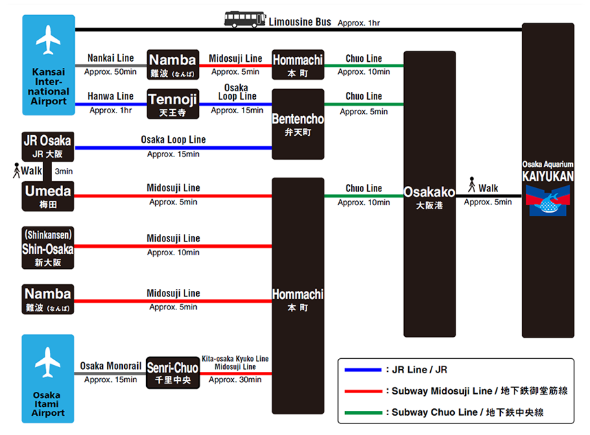 从关西国际机场(Kansai International Airport)出发:从关西机场站换乘电车约需65分钟,或者利用到海游馆的直达交通车约需60分钟。从大阪国际机场(Osaka-Itami)出发:换乘电车约需60分钟。电车: