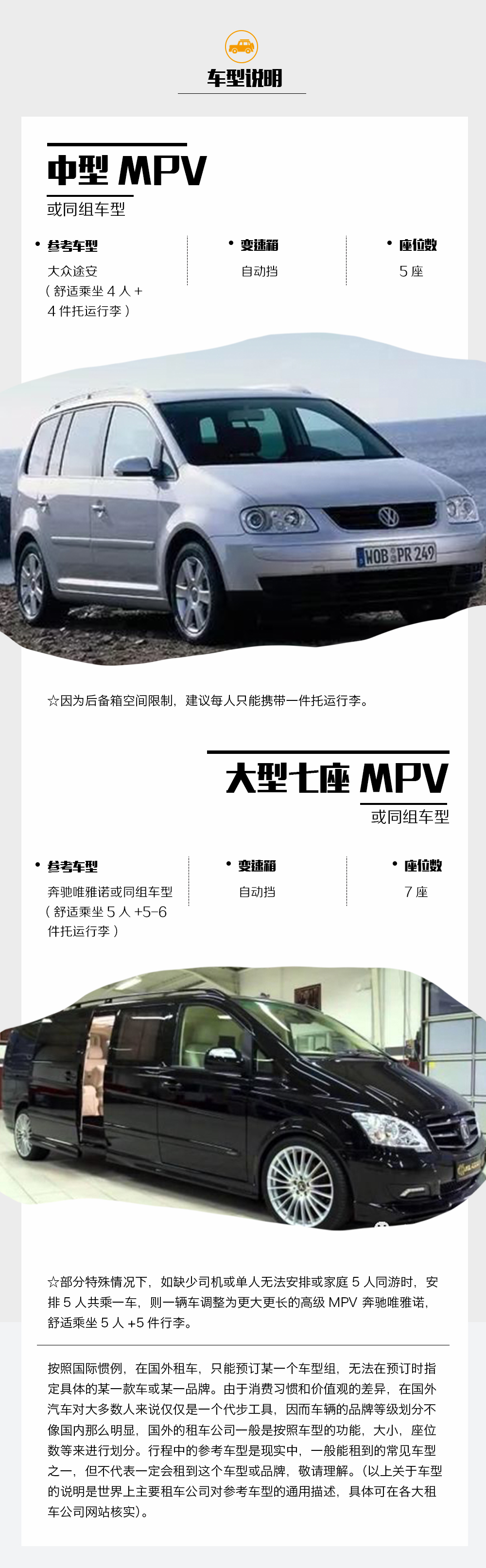 3. 租车(可变更为包车或乘坐公共交通旅行所需车票):旅行车一台或可根据需求调整成紧凑型SUV、中大型SUV、MPV车组或其他车组;
