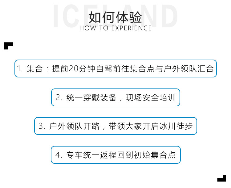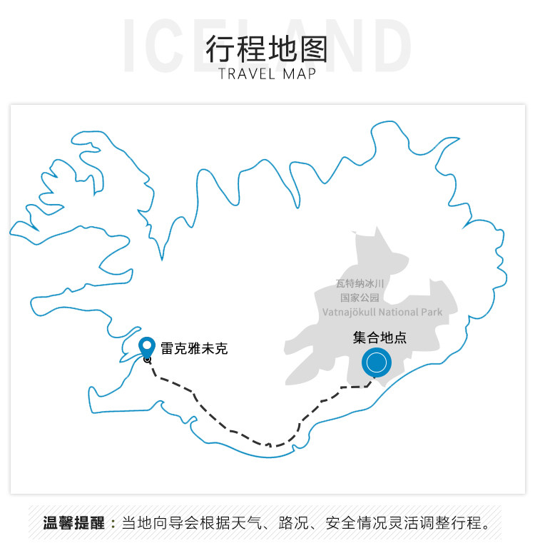 5. 冰岛所有的行程和户外活动主要取决于天气条件。冰岛冬季天气变幻莫测,出于您的安全考虑,我们有权改变或取消行程。夏季行程很少会受恶劣天气的不利影响。如遇天气恶劣等不可控因素,行程可能有所变动,强烈建议您在行程前一天按照出行凭证上的联系方式自行联系供应商/酒店前台是否取消,您可根据要求选择改期或退款;如选择改期再次体验,具体时间届时请自行和供应商确认。