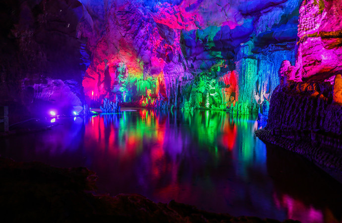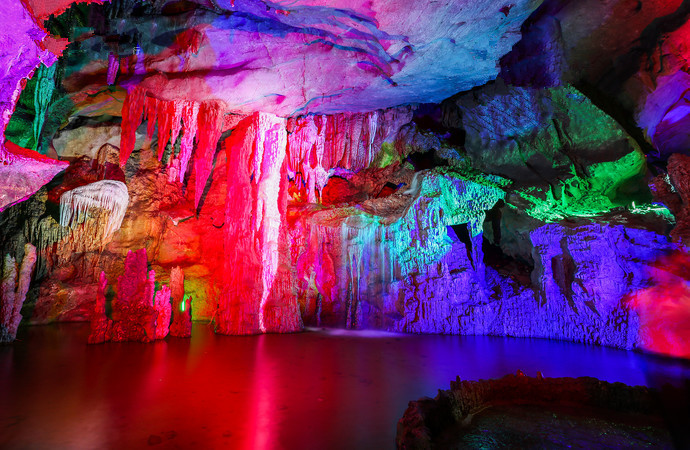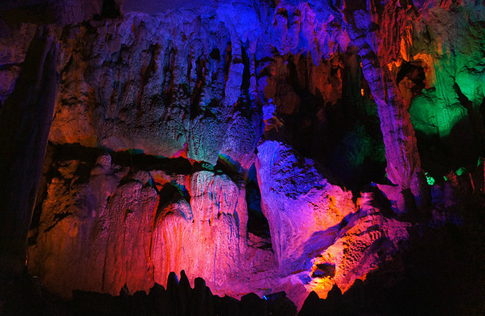 聚龙潭位于古榕公园、月亮山之间,由黑岩和水岩两大岩洞组成,是阳朔境内的“一洞水陆两游”的地方,也是“藏龙卧虎”最多的地方。水陆兼程一千米,洞内穹顶最高处有25米,最宽处30米左右。无数条钟乳石很象“龙”,有卧龙、盘龙、游龙、飞龙、舞龙、金龙、玉龙、青龙、黄龙、龙王、龙女、龙子、龙孙,数不胜数,形态逼真,惟妙惟肖。特色1岩外青山隐隐,绿水悠悠,宛如群龙驾雾,故名“聚龙潭”。