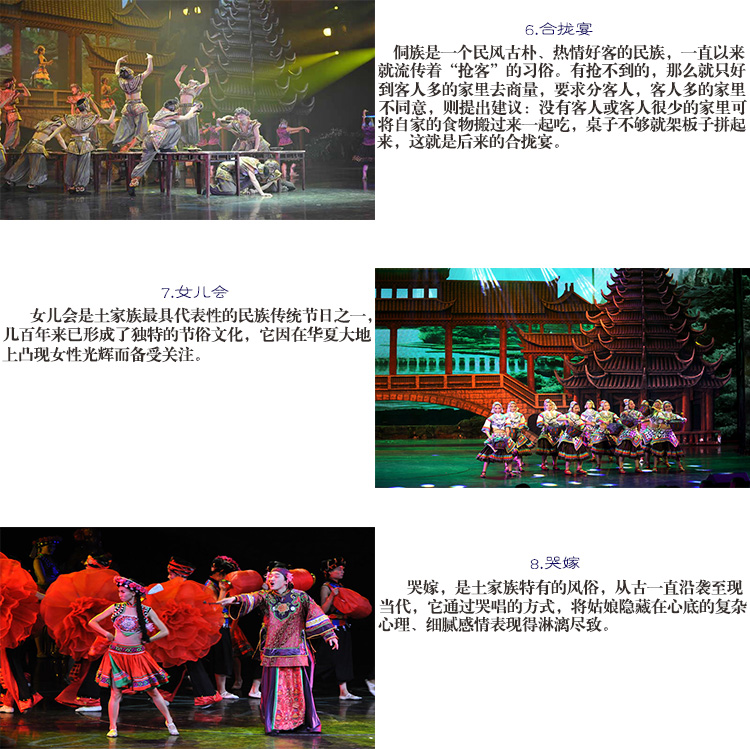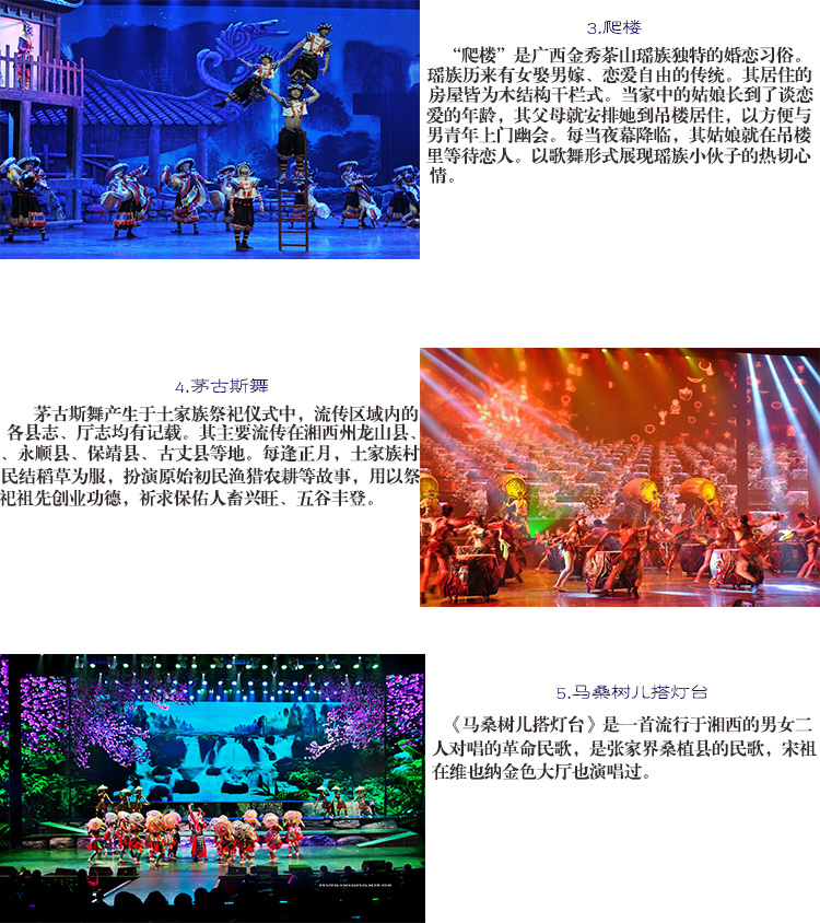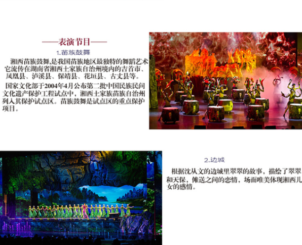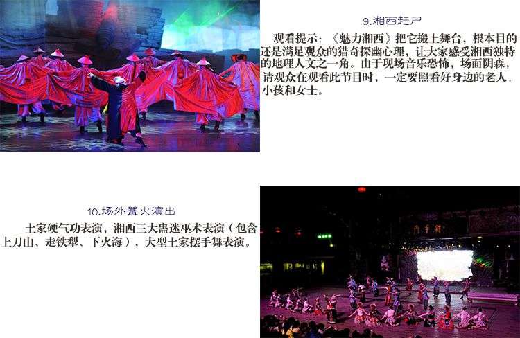 主要节目有:湘西赶尸、土家哭嫁、女儿会、鬼谷神功、湘西赶尸、湘西苗族鼓舞等各种一系列特色少数名族大型表演,将会带给你一场视觉上的盛宴~