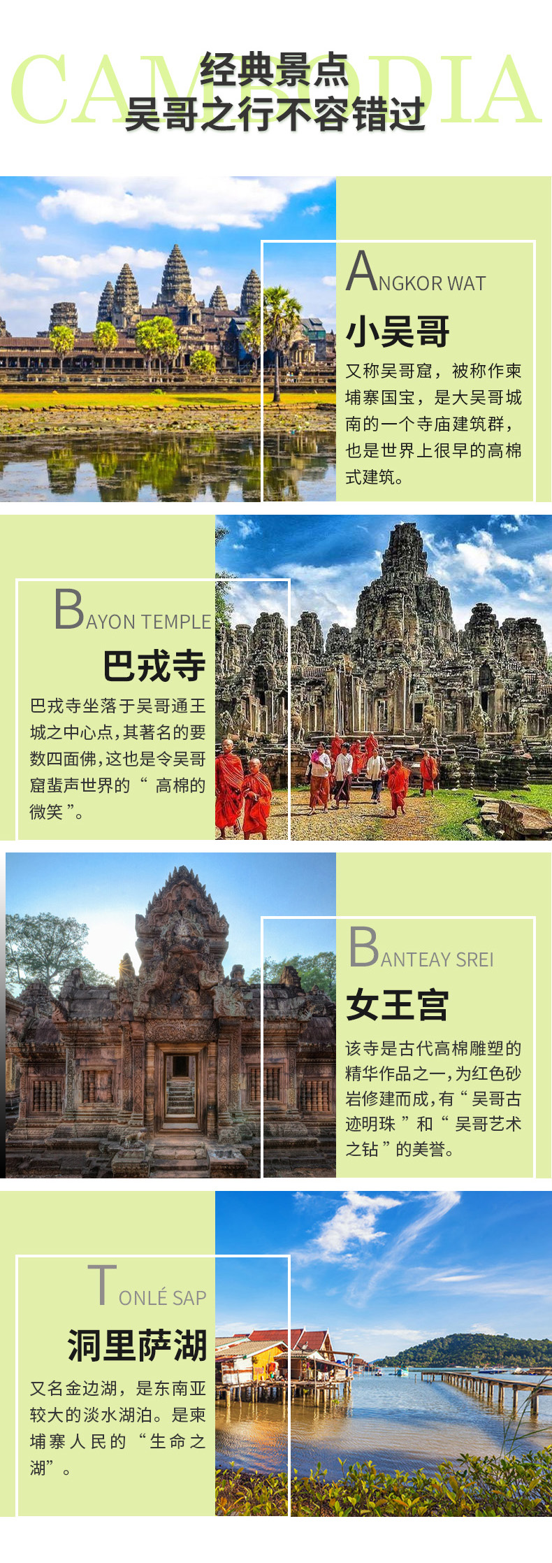 3. 日出日落:我们将为您安排吴哥窟最经典最精华的日出日落,可根据您的时间及行程进行选择,如:巴肯山日落(绑定小圈),小吴哥寺日出(绑定大圈),洞里萨湖日落(绑定外圈)可选;