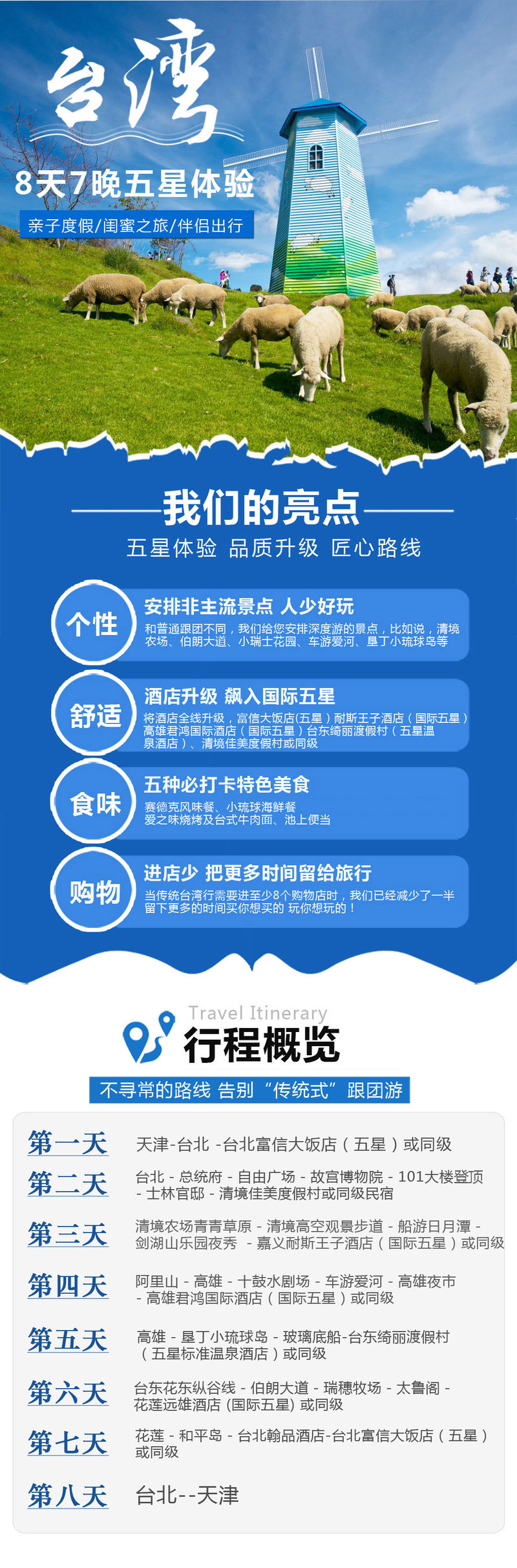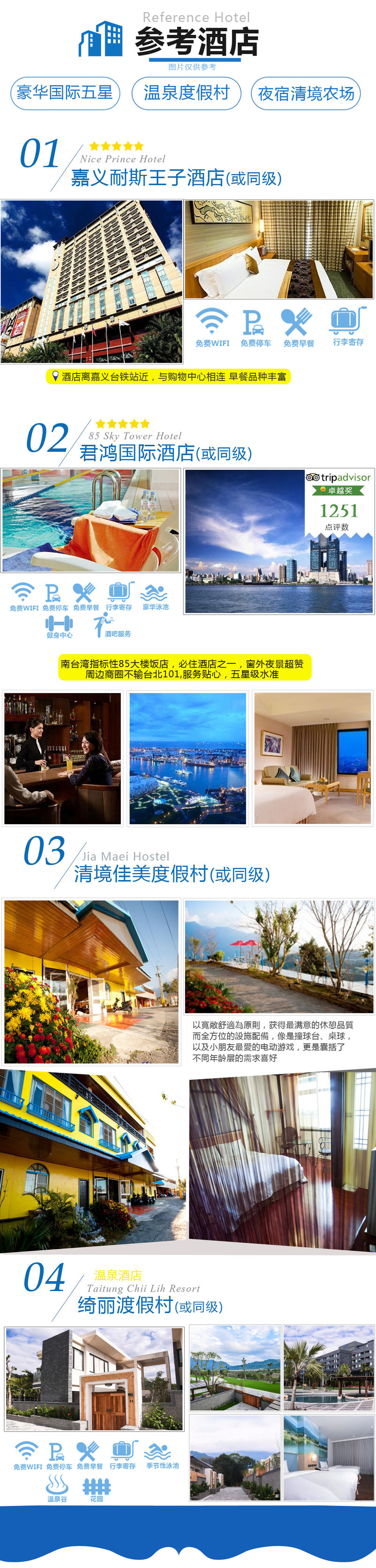 2.酒店:当地入住7晚,台北五星富信酒店、四晚挂牌五星酒店、两晚特色民俗(入住清境农场)、一晚台北翰品酒店(近夜市、捷运);