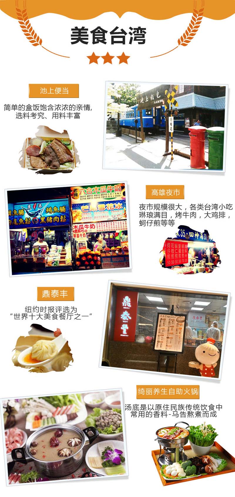 3.用餐:行程中所包含的7早12正,(五星酒店海鲜自助盛宴、挂牌四星翰品酒店牛排餐、星级米其林鼎泰丰、绮丽养生自助火锅);