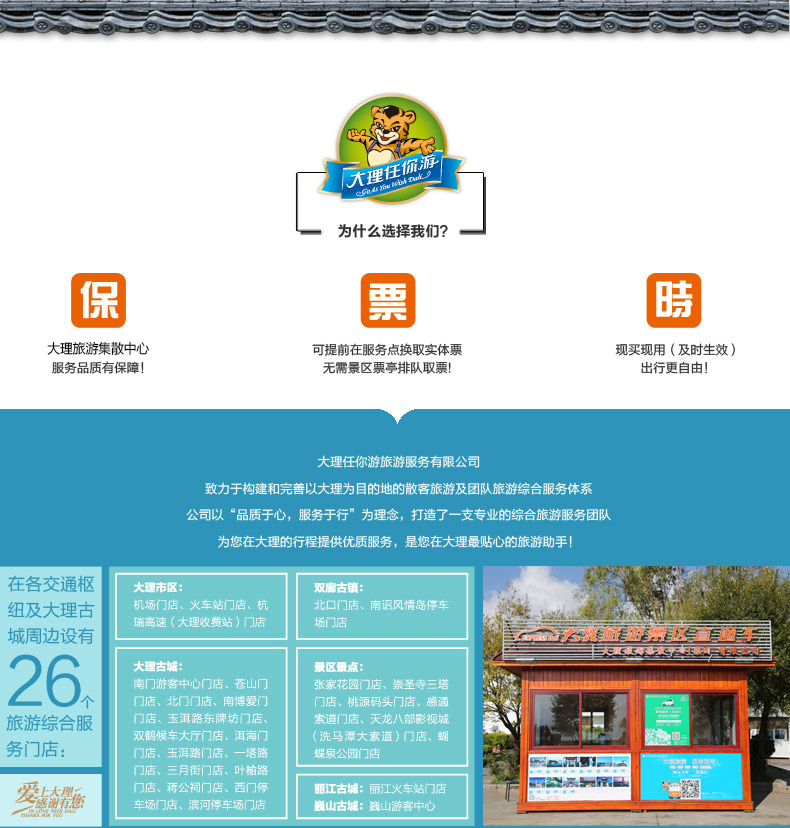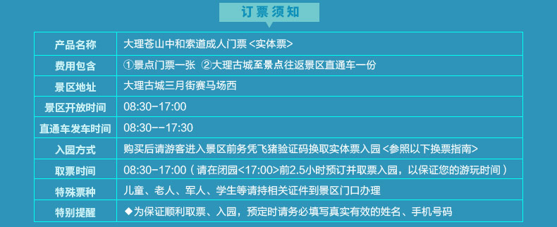1. 取票方式:游玩当天前往大理古城指定服务点凭预订后手机短信换取景区实体门票。