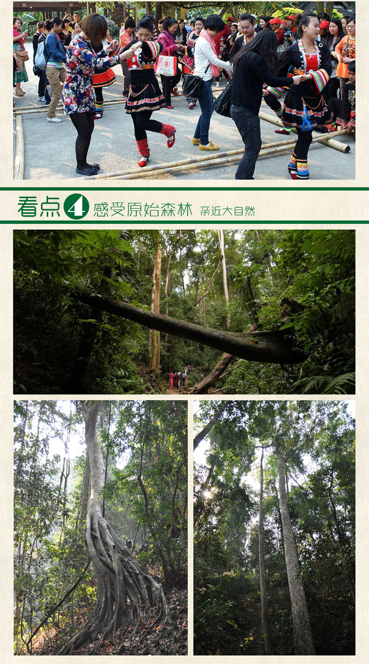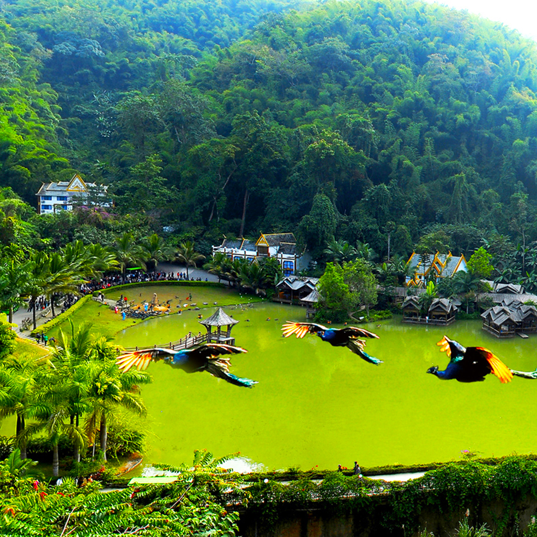 1. 原始森林公园大门票+园区往返电瓶车; 2. 观看孔雀山庄孔雀放飞; 3. 各种动物表演; 4. 爱伲族民族风情表演。