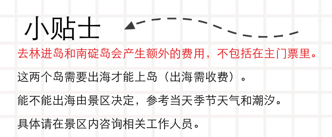 3. 景区门票包含:主景区门票,不包括林进屿、南碇岛,游玩时需坐船费用自理。