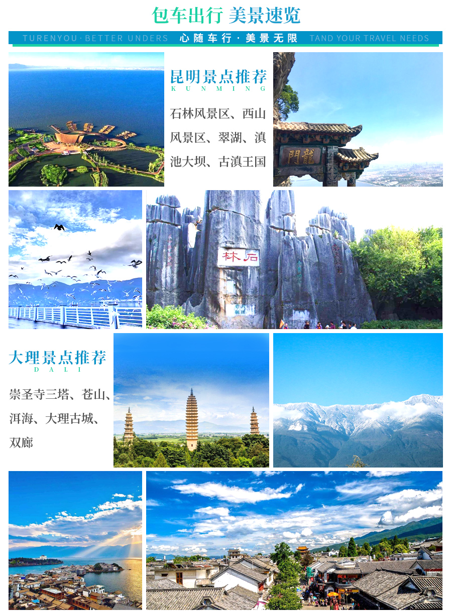 昆明、大理、丽江、香格里拉、泸沽湖、西双版纳、腾冲、瑞丽等地均可以接送,具体根据包车路线天数决定。