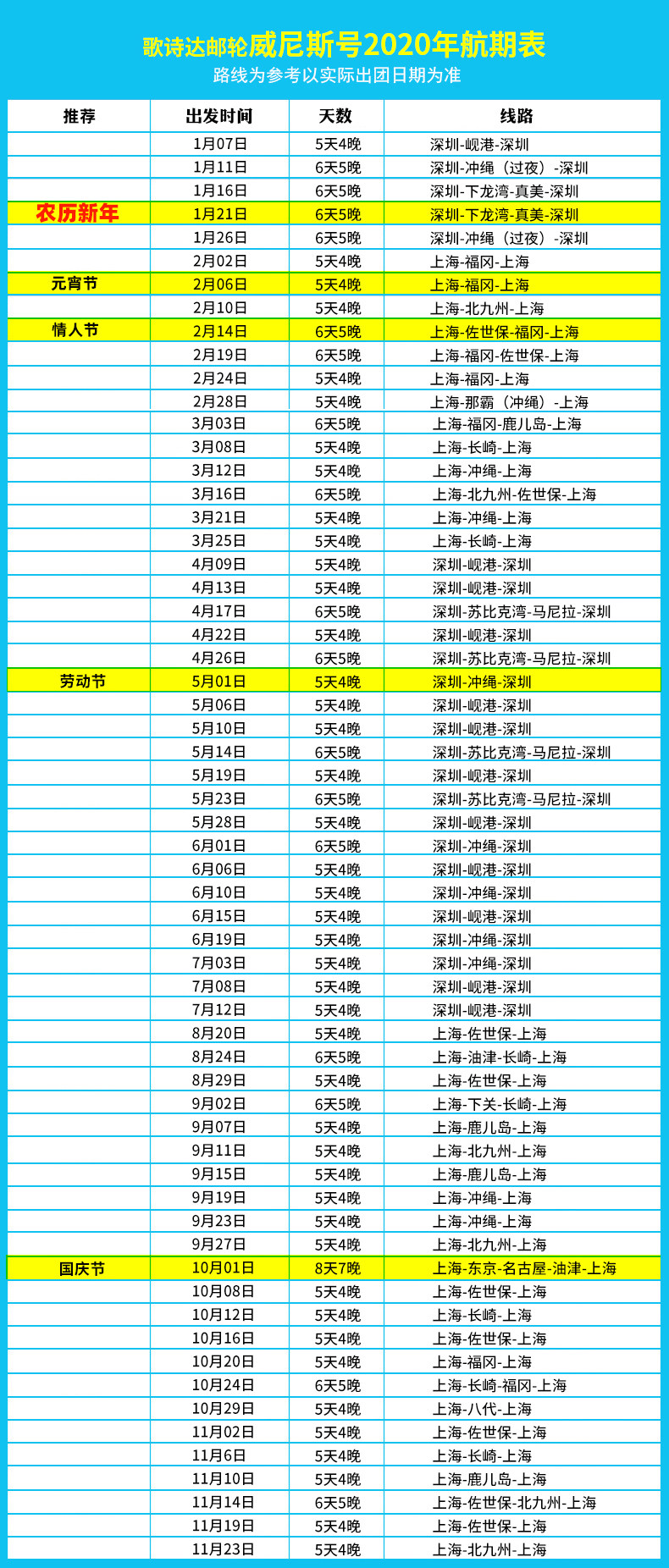 2、邮轮行程中所列航班号、时间、岸上观光行程内容及邮轮抵离时间仅供参考,请以给您的确认出团通知书为准,严格遵守时间结点集合,因游客自身原因导致误机、误船,产生必要费用由游客自行承担。