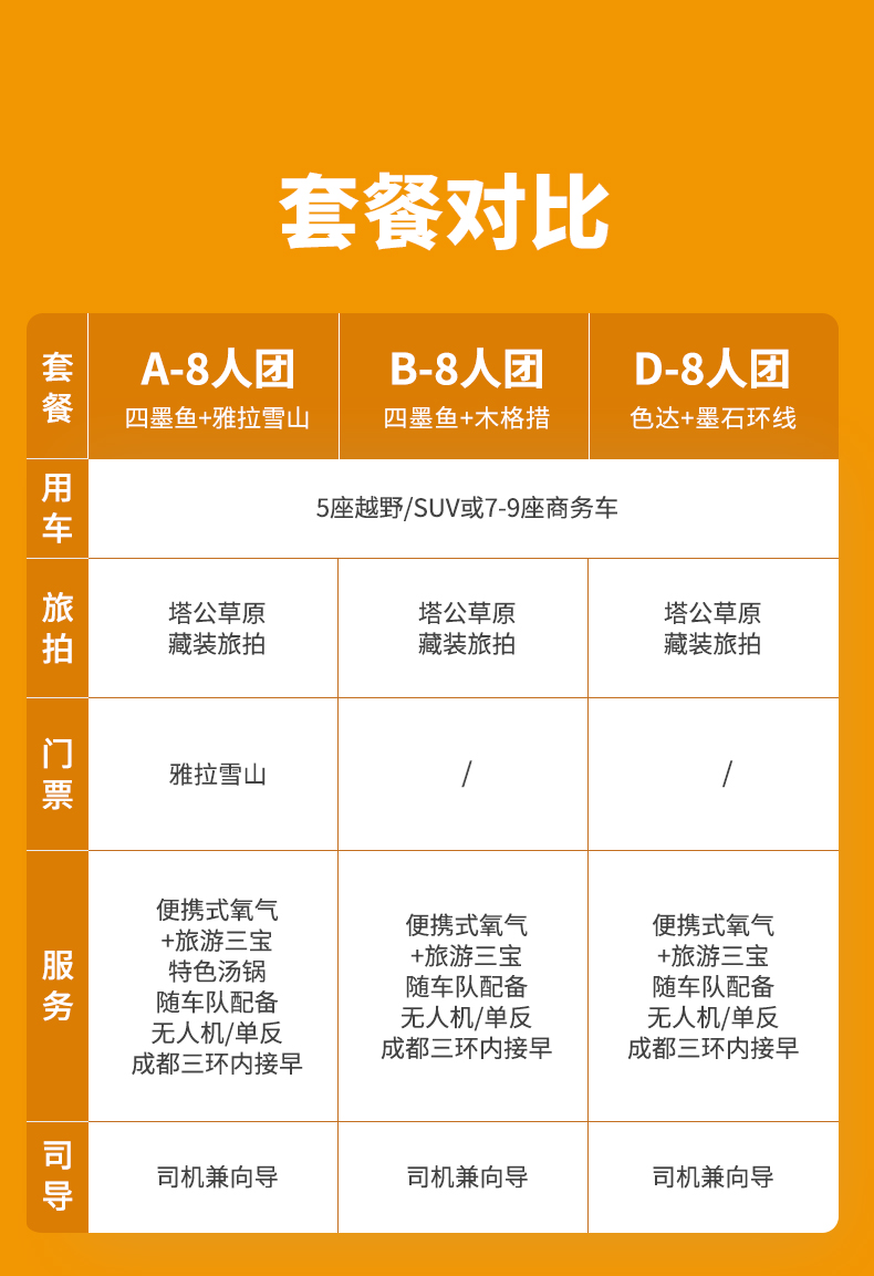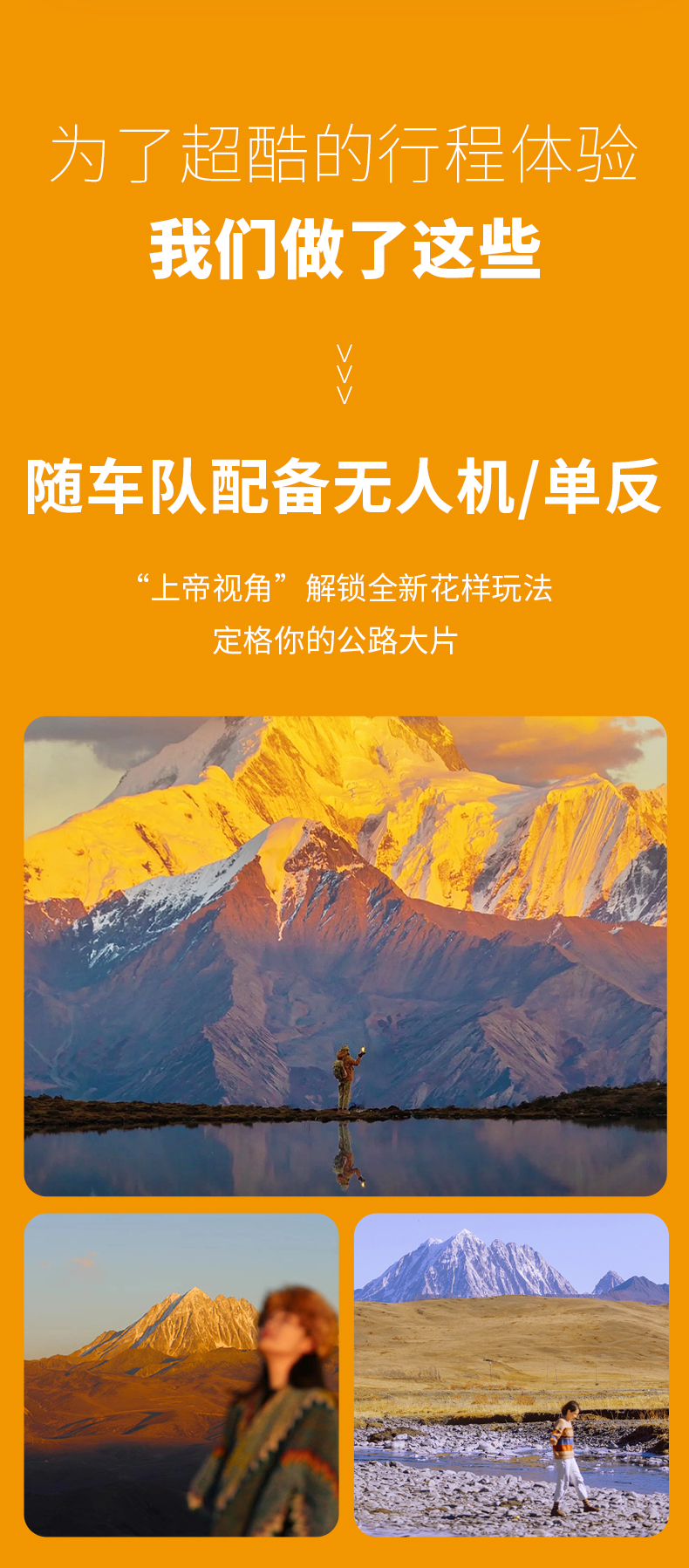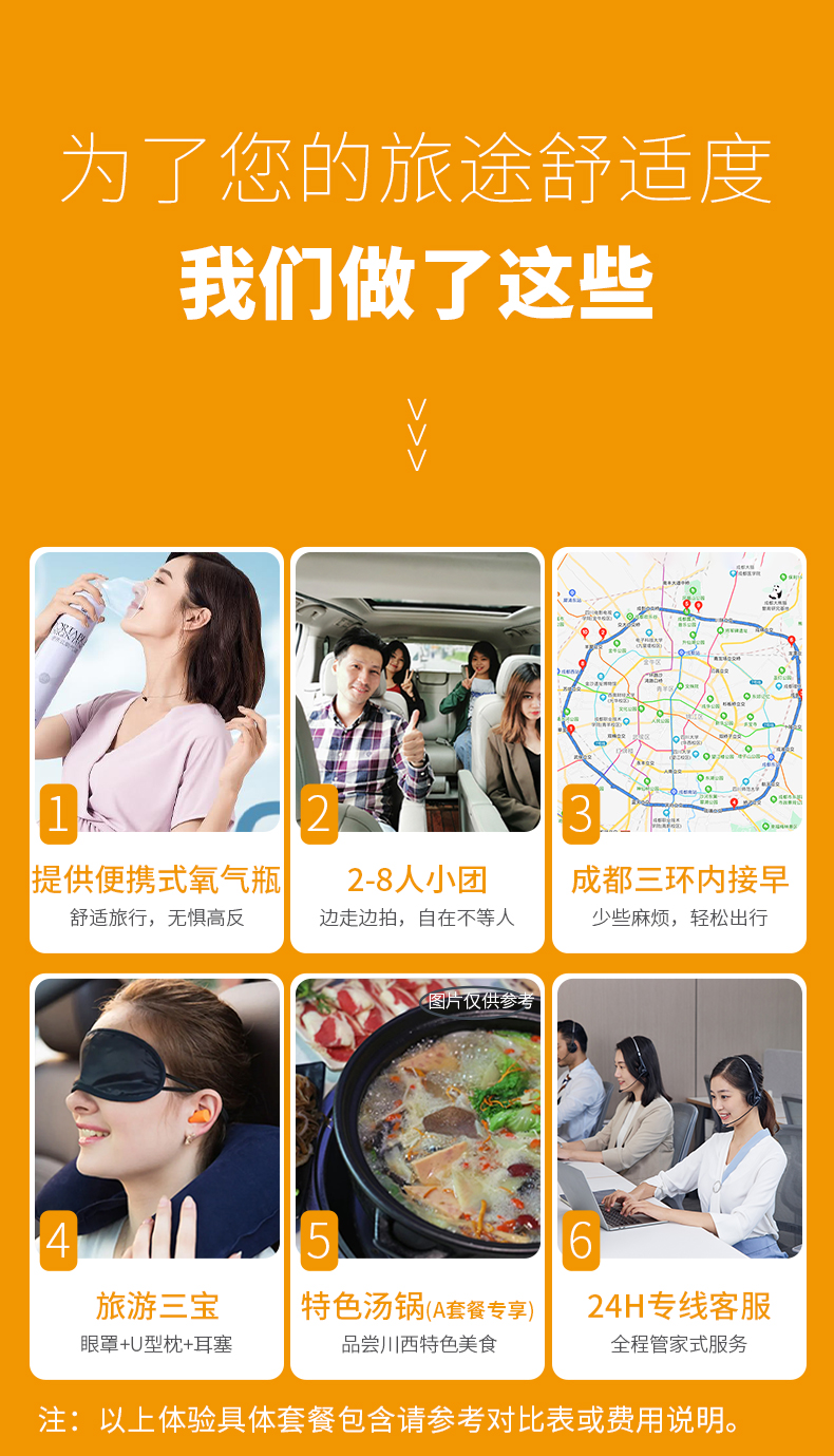 B套餐 赠 成都三环内接早、便携式氧气瓶、旅游三宝、随车配备无人机或单反(仅供使用)、塔公藏装旅拍(赠3张精修照片)。