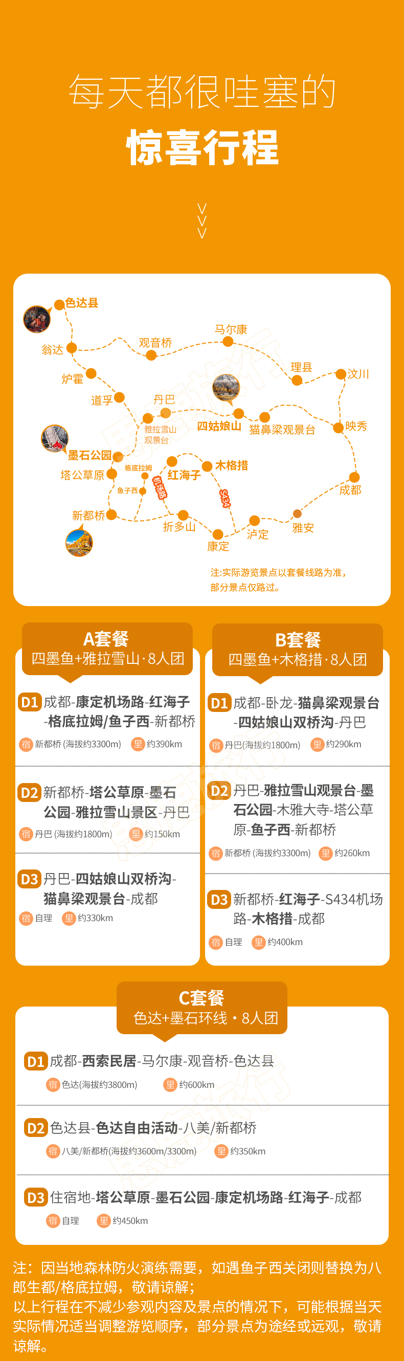 A套餐 不含四姑娘山双桥沟门票观光车150/人、鱼子西清洁费20/人、格底拉姆/鱼子西需现补中转车60-100/人、甲居50/人、墨石公园门票60+观光车20/人、雅拉雪山观光车90/人。