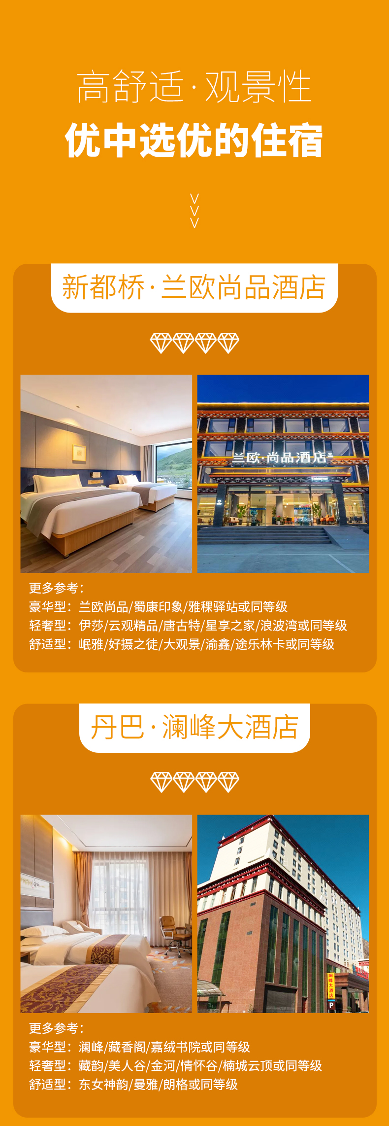 舒适型:新都桥(新都桥途乐林卡、岷雅庄园、德瀚、渝鑫、大观景、好摄之徒、锦城酒店、康藏华庭酒店、凯逸酒店、紫海庄园酒店、伍城酒店、虞悦酒店、雅之家或同级)、丹巴(丹巴金珠酒店、丹巴鑫鑫酒店、星炎酒店、瑞象酒店、甲居风情酒店、丹巴朗格酒店、雍吉酒店、尚客优酒店、雅古都酒店、古碉情酒店、丹巴大酒店或同级)。
