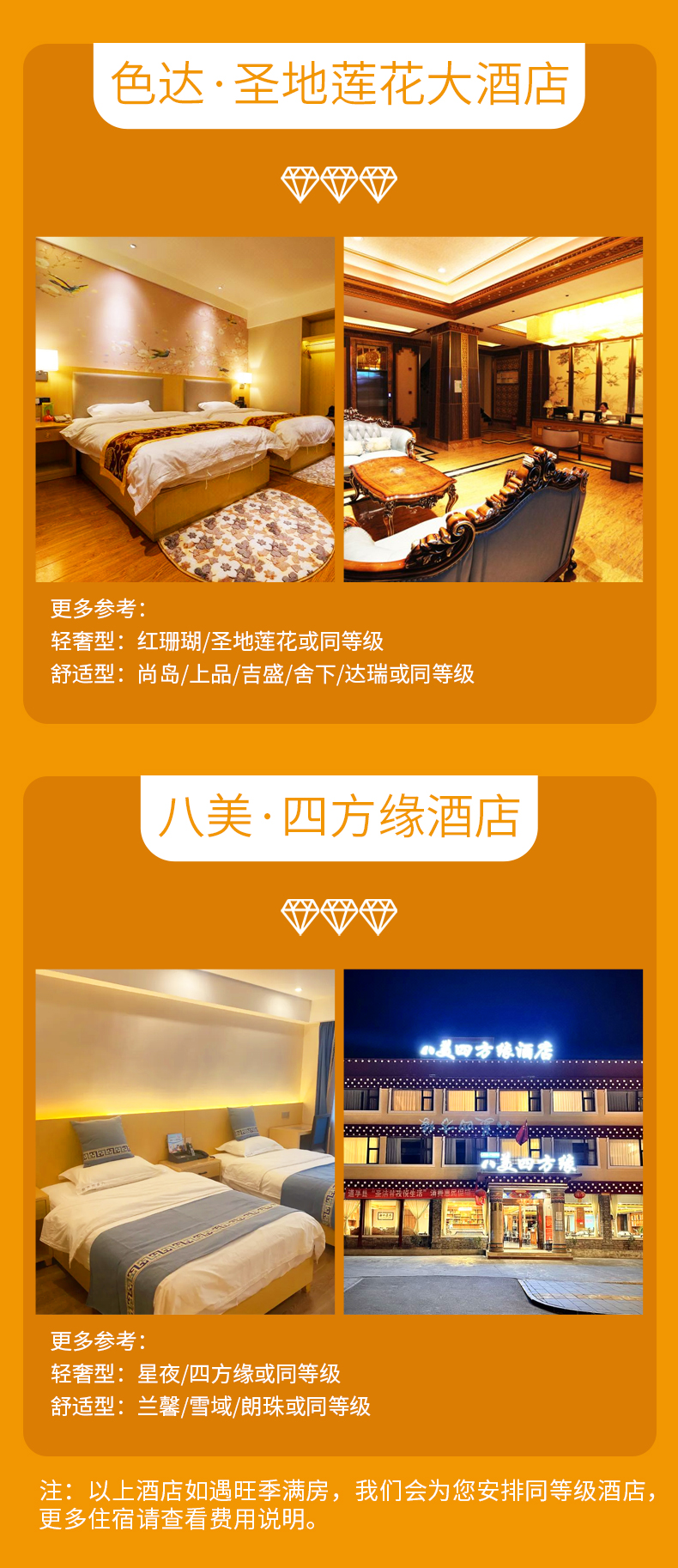 舒适型:色达(尚岛/上品/吉盛/舍下/达瑞或同级)、新都桥(途乐林卡/岷雅庄园/德瀚/渝鑫/大观景/好摄之徒或同级)或八美(兰馨/雪域/朗珠或同级)。