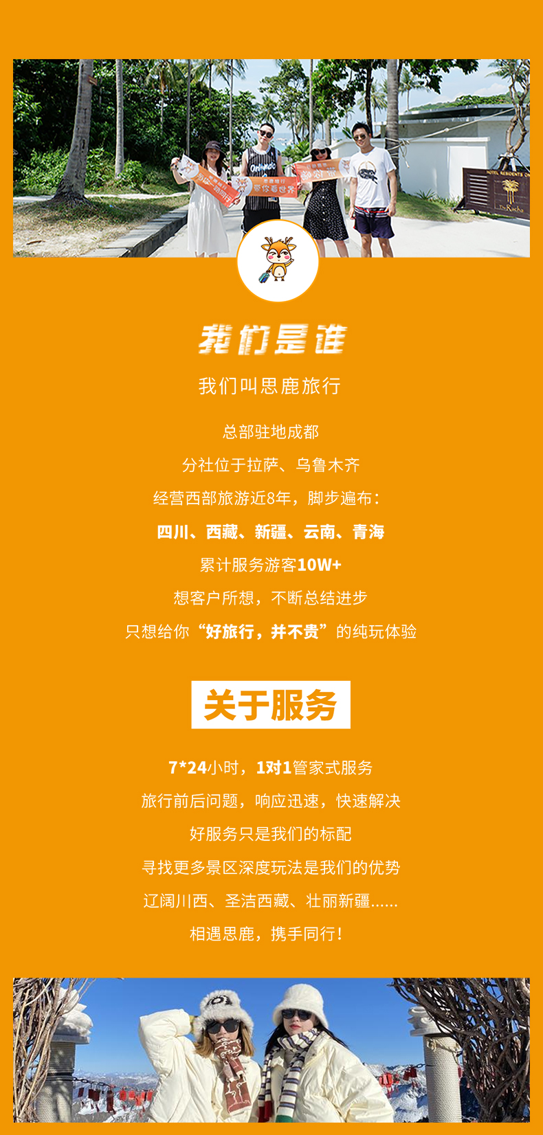 6、行程在不改变参观内容及景点的条件下,本公司有权作前后调整。藏区属于未被开发地区,很多景点有特殊性,如果想去我社没有注明的景点,产生安全与费用与旅行社无任何关系,并请配合司机签下免责协议。
