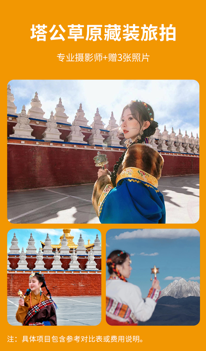 A套餐 赠 成都三环内接早、便携式氧气瓶、旅游三宝、随机配备无人机或单反(仅供使用)、塔公草原藏装旅拍(精修3张电子照片,底片全送)。