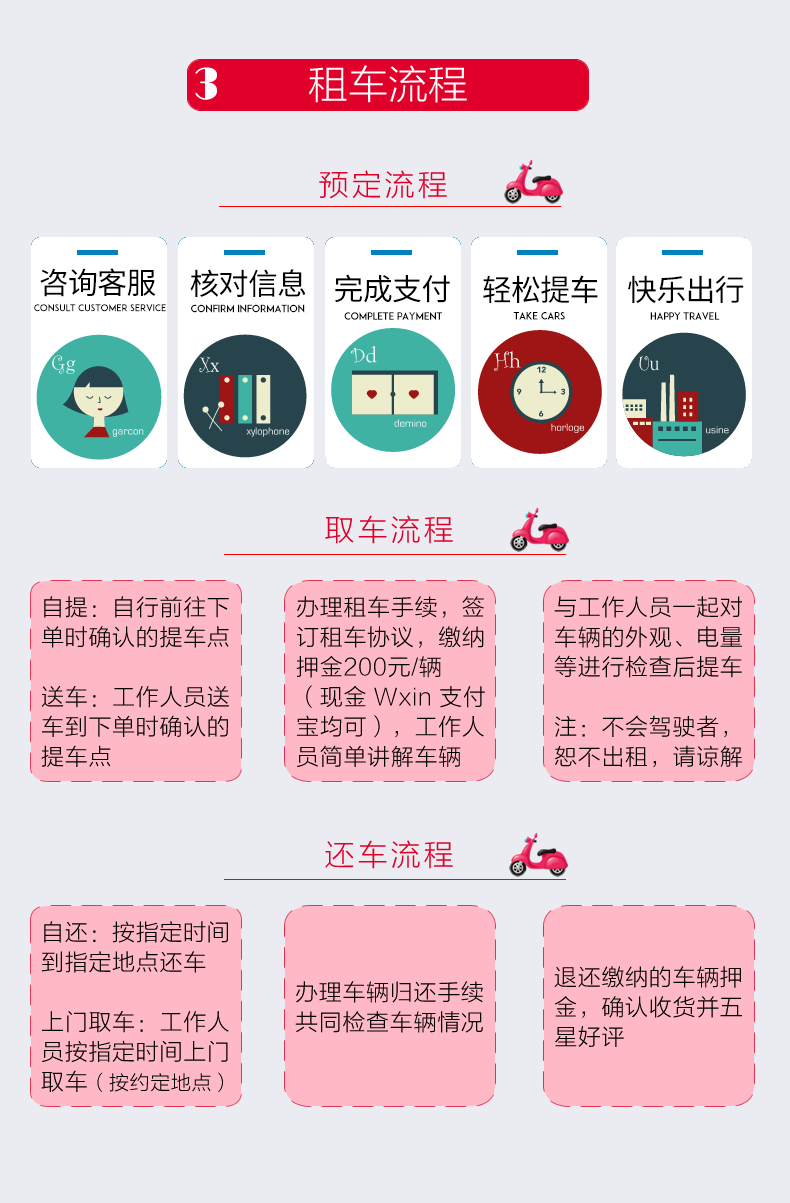 2. 顾客于现场提车时一次性足额交付相应押金押金为200元,还车后,我方退返押金;