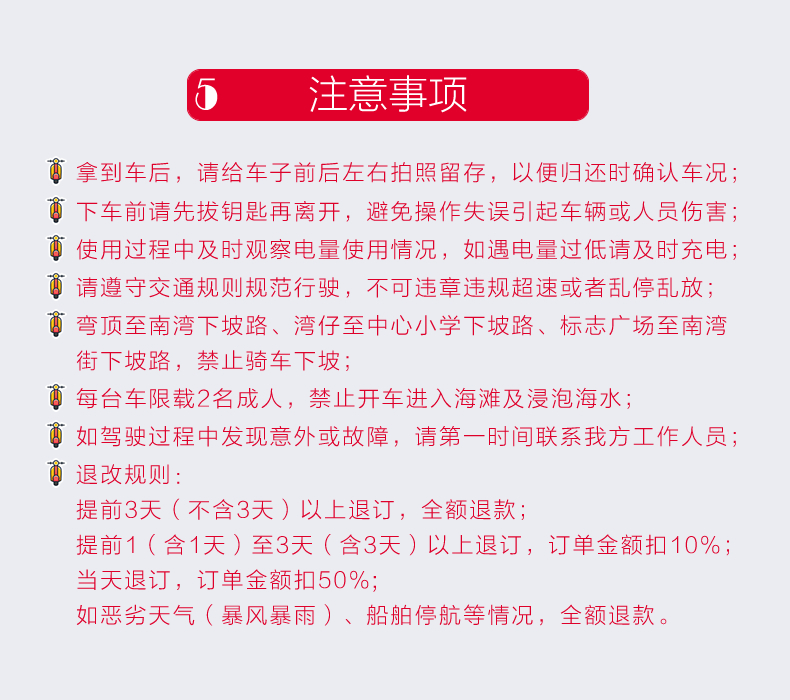 4. 您所预订的商品可能包含高危项目(如游泳、漂流、潜水、滑雪等),参与前请根据自身条件, 并充分参考当地相关部门及其它专业机构的相关公告和建议后出行,出行前请仔细阅读《安全防护指南》;