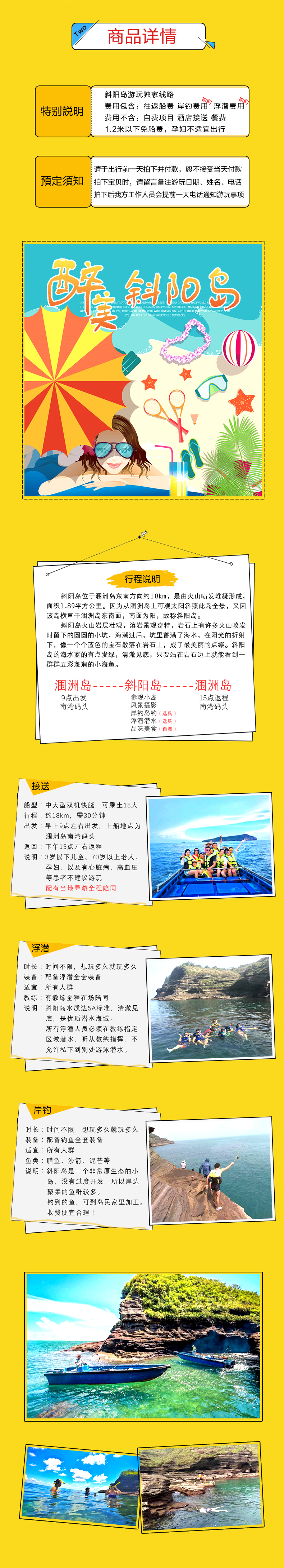1. 斜阳岛往返船费,岸钓费用(配渔具鱼饵,选购),浮潜费用(选购);