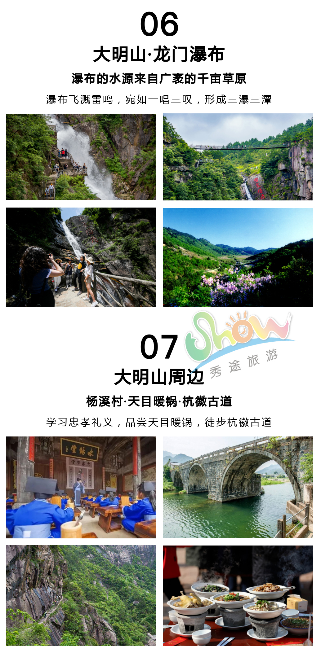 大明山景区Daming Mountain·位于安徽浙江交界地带,既有黄山的奇峰怪石,又有浙西山水的明秀。 ·以千亩草甸最为著名,因面积最大且平整,当年被朱元璋选为根据地。 ·景区内一年四季皆是景色,春天踏青,夏日避暑,冬季是滑雪胜地。穿越万米岩洞、走悬空栈道。 ·龙门峡口是登山的起点,也是大明...