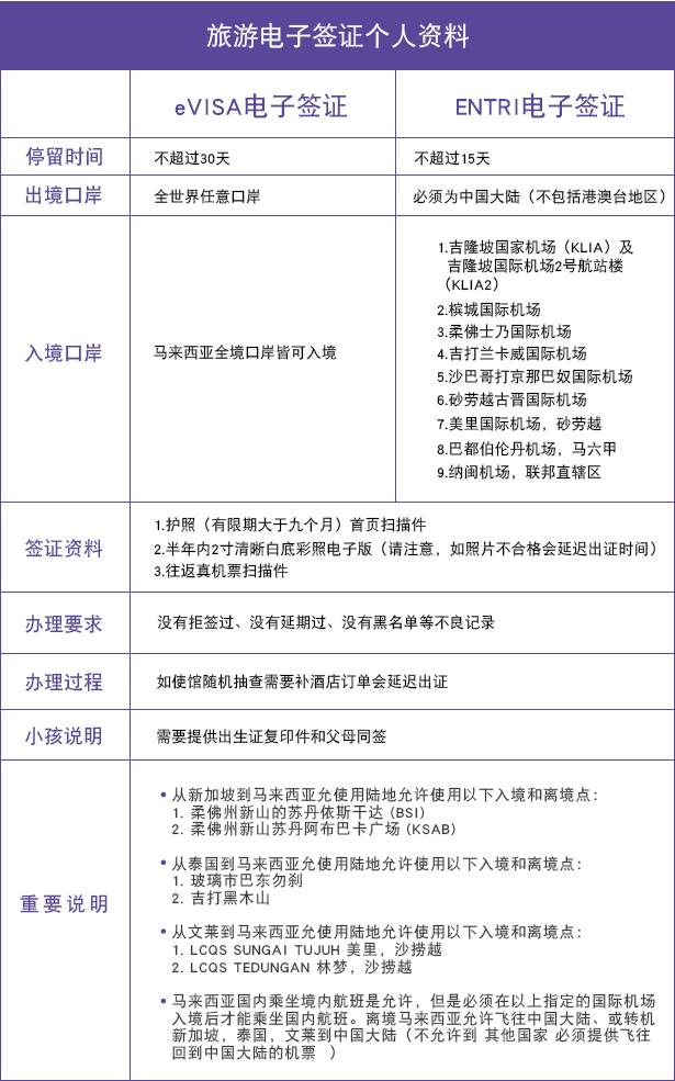 此类签证(ENTRI)对入境口岸有限制,只可通过以下指定机场关口入境和离境: 1.吉隆坡国际机场(KLIA1) 2.吉隆坡国际机场2号航站楼(KLIA 2) 3.槟城国际机场,槟城(PEN) 4.士乃国际机场,柔佛(JHB) 5.兰卡威国际机场,吉打(LGK) 6.哥打京那巴奴国际机场,沙巴亚庇(BKI) 7.古晋国际机场,砂劳越(KCH) 8.巴都伯伦丹机场,马六甲(KBU) 9.纳闽机场,联邦直辖区(LBU) ENTRI对行程的限制:允许搭乘从中国直飞马来西亚,或者从中国前往马来西亚途径新加坡或者泰国或者文莱转机的航班。 所有申请人只能经由马来西亚直航回中国或途径新加坡、泰国、文莱航班返回中国。